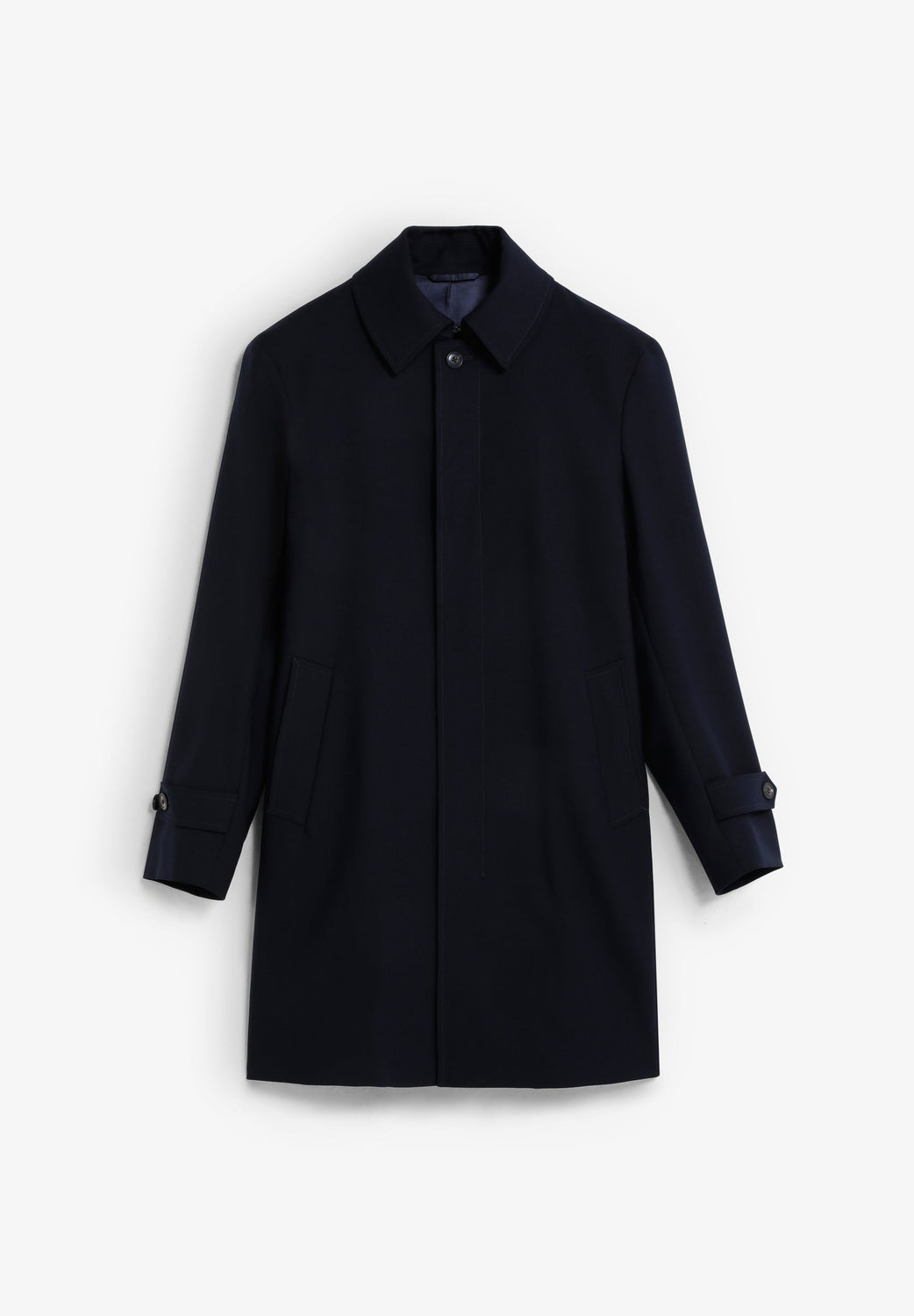 Trench coat made of 100% wool. Concealed button fastening. Adjustable buttoned cuffs. Shirt collar.