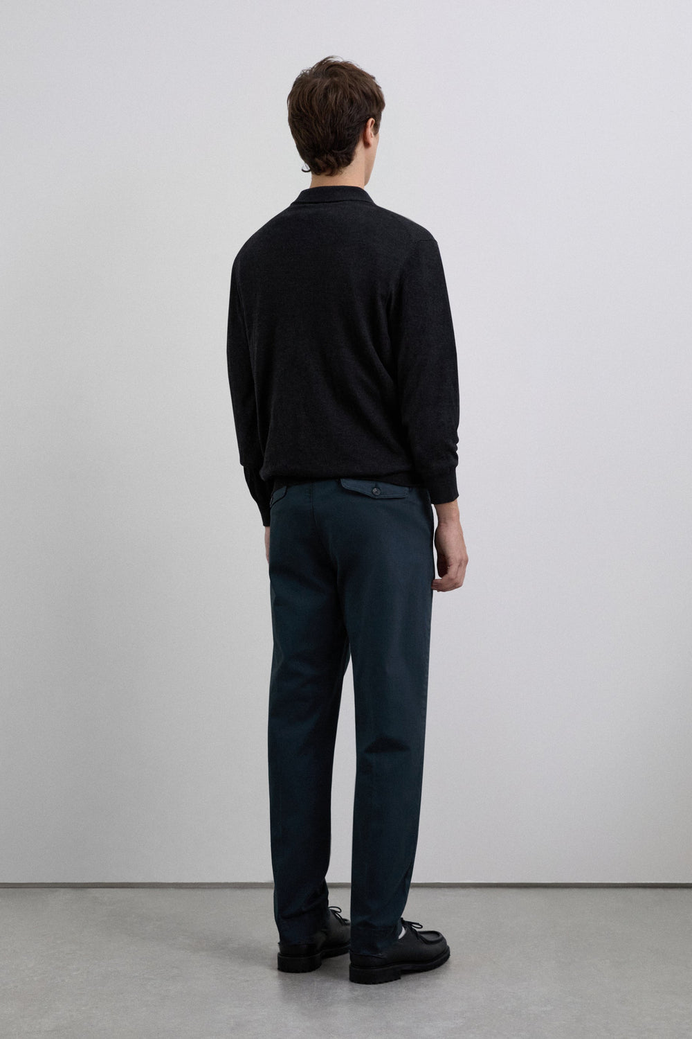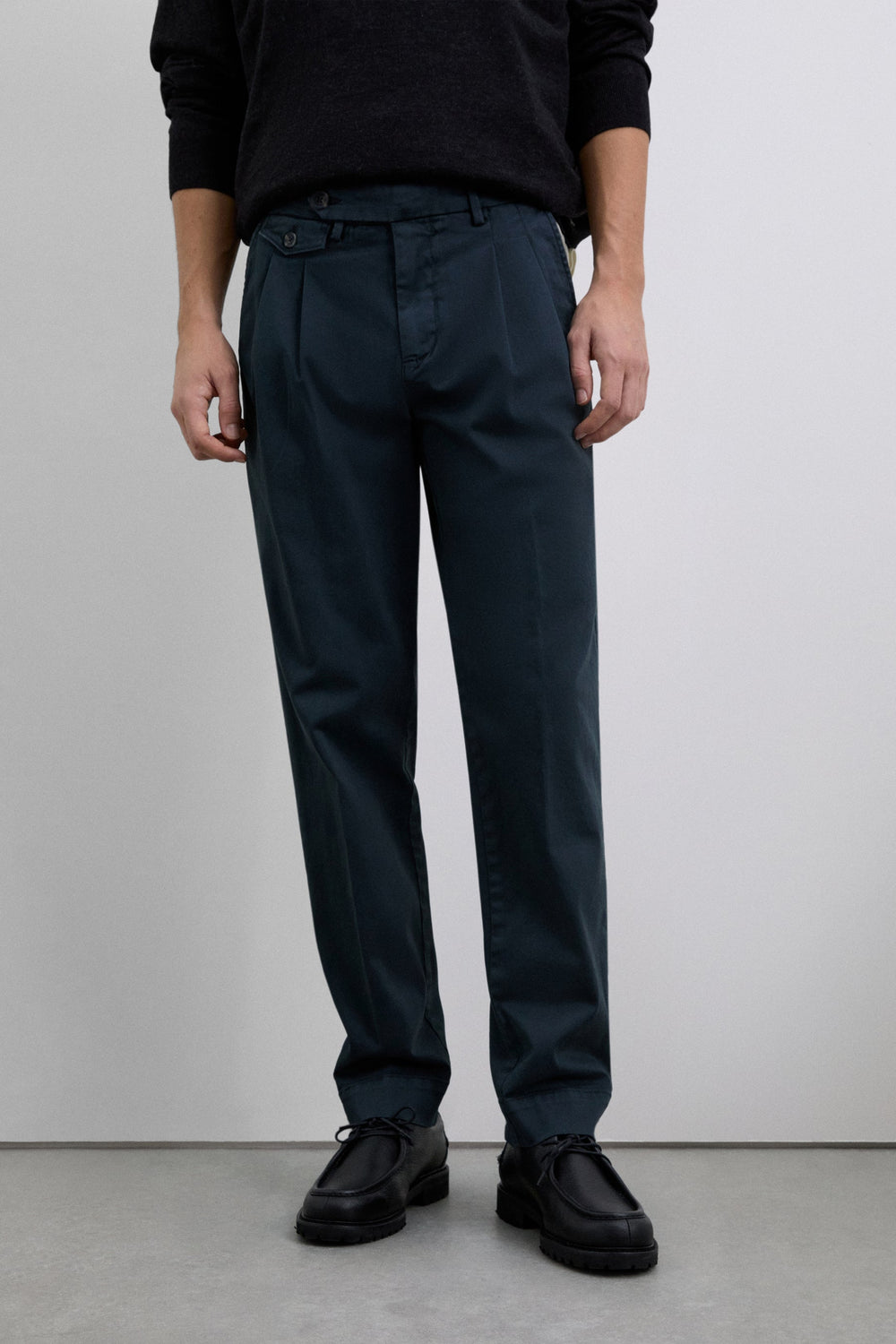 Cotton trousers with darts. Regular fit. Waistband with front pleat detail. Side pockets and back pockets with piped seam detail. Front zip and button fastening.