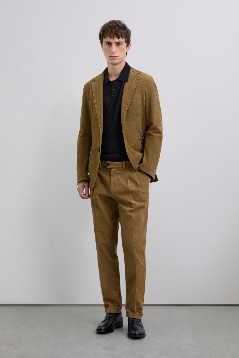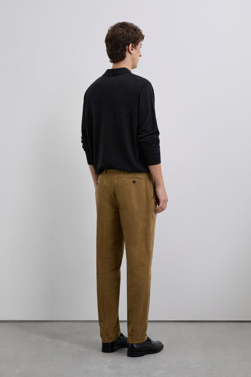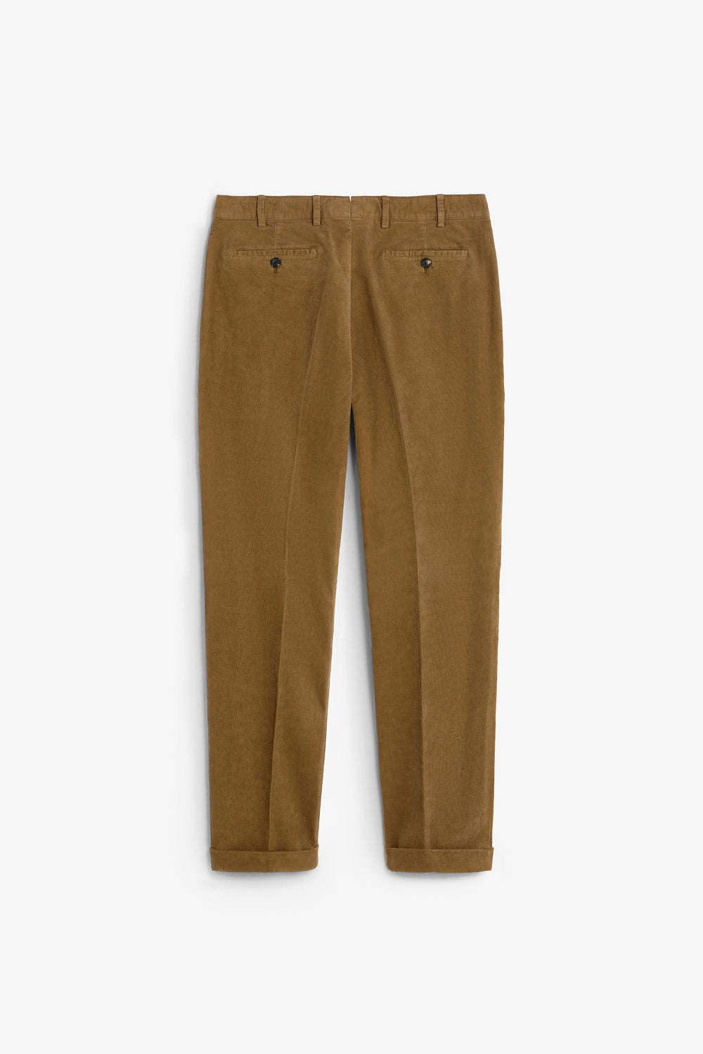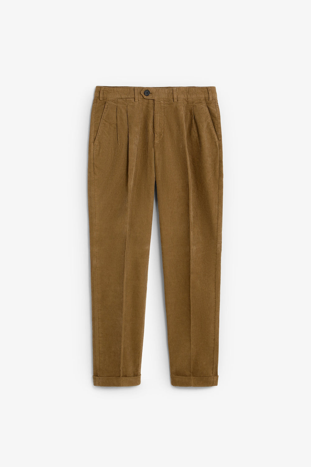 Corduroy chino trousers made of cotton. Loose fit with darts. Concealed zip fastening with an extended button at the waist. Side and back pockets.