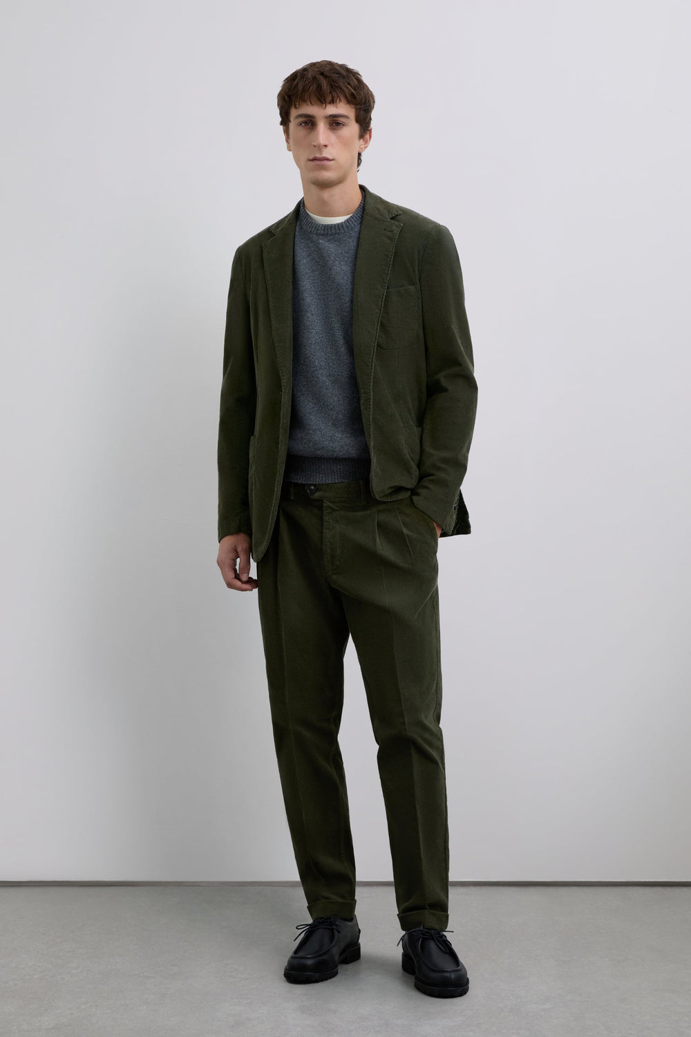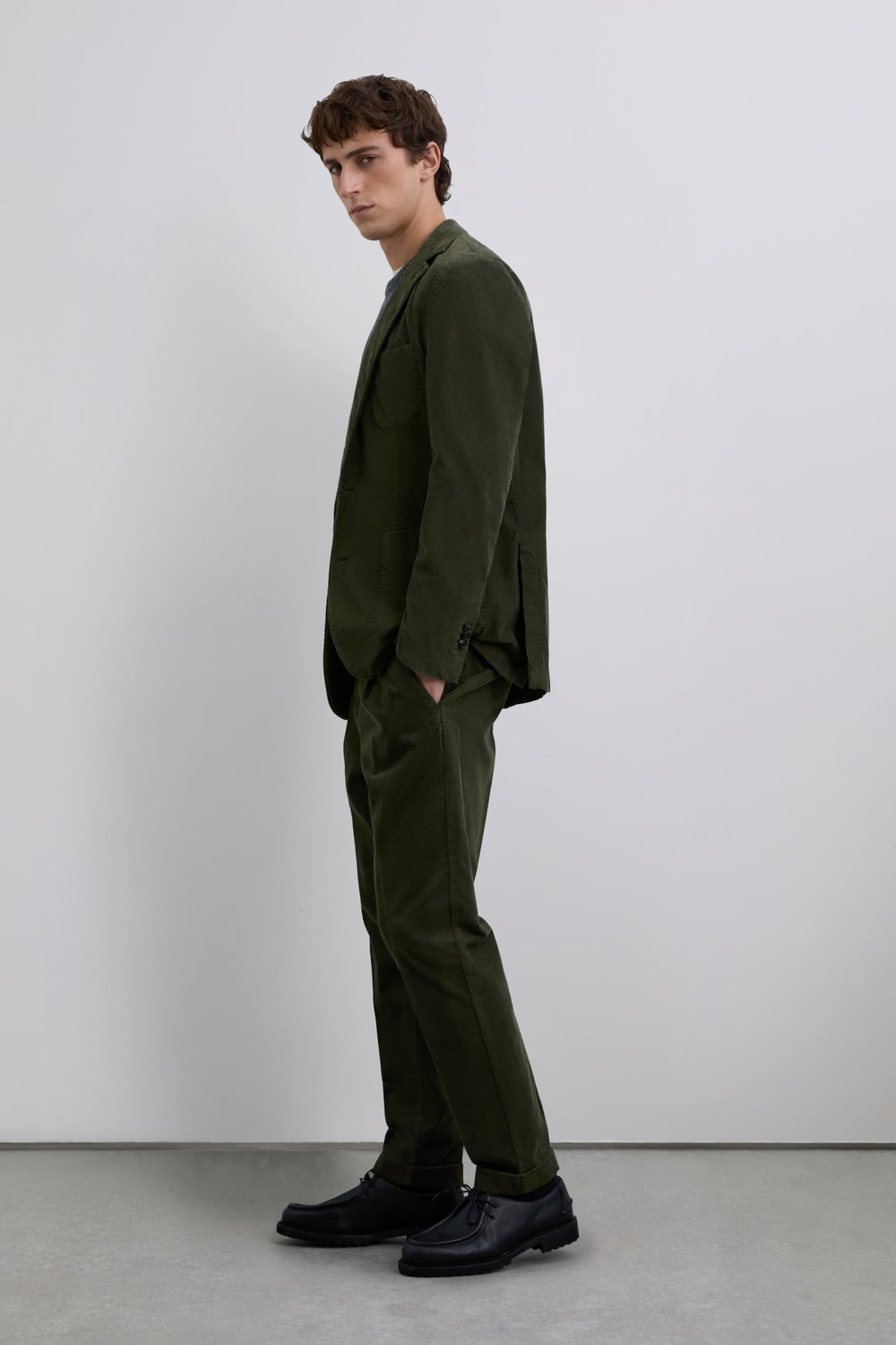 Corduroy chino trousers made of cotton. Loose fit with darts. Concealed zip fastening with an extended button at the waist. Side and back pockets.