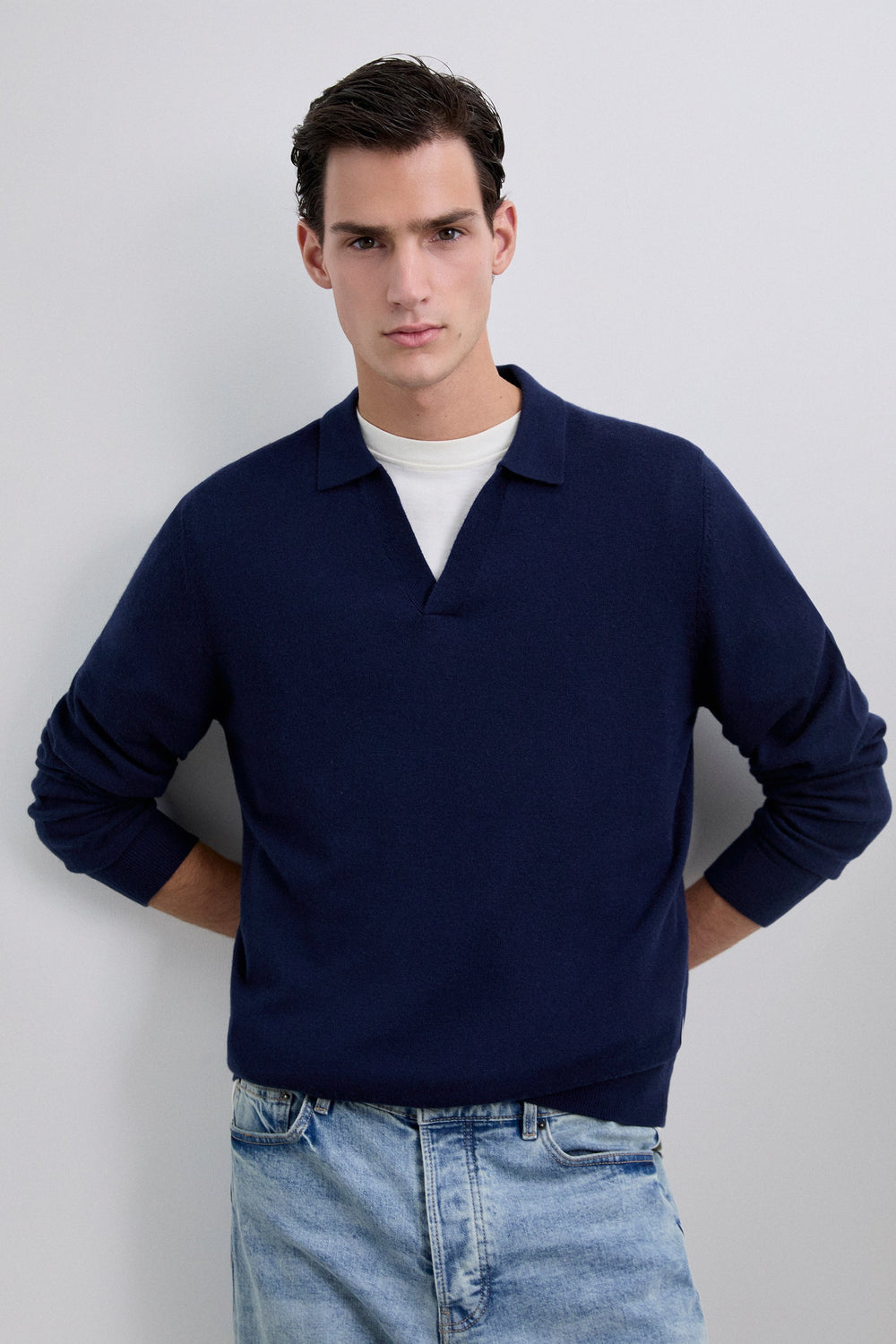 Polo shirt made of wool. Long sleeves. Ribbed trim. V-neck.