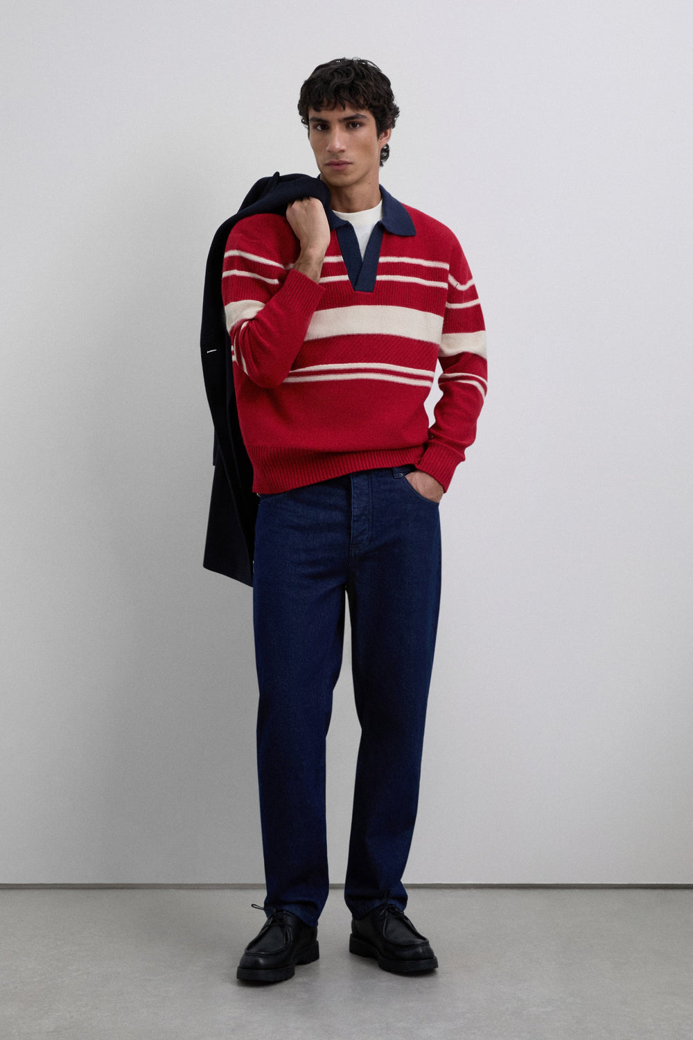 Wool and BCI cotton sweater. Regular Fit. Stripe print. Contrast polo shirt collar. Long sleeves. Ribbed trim.