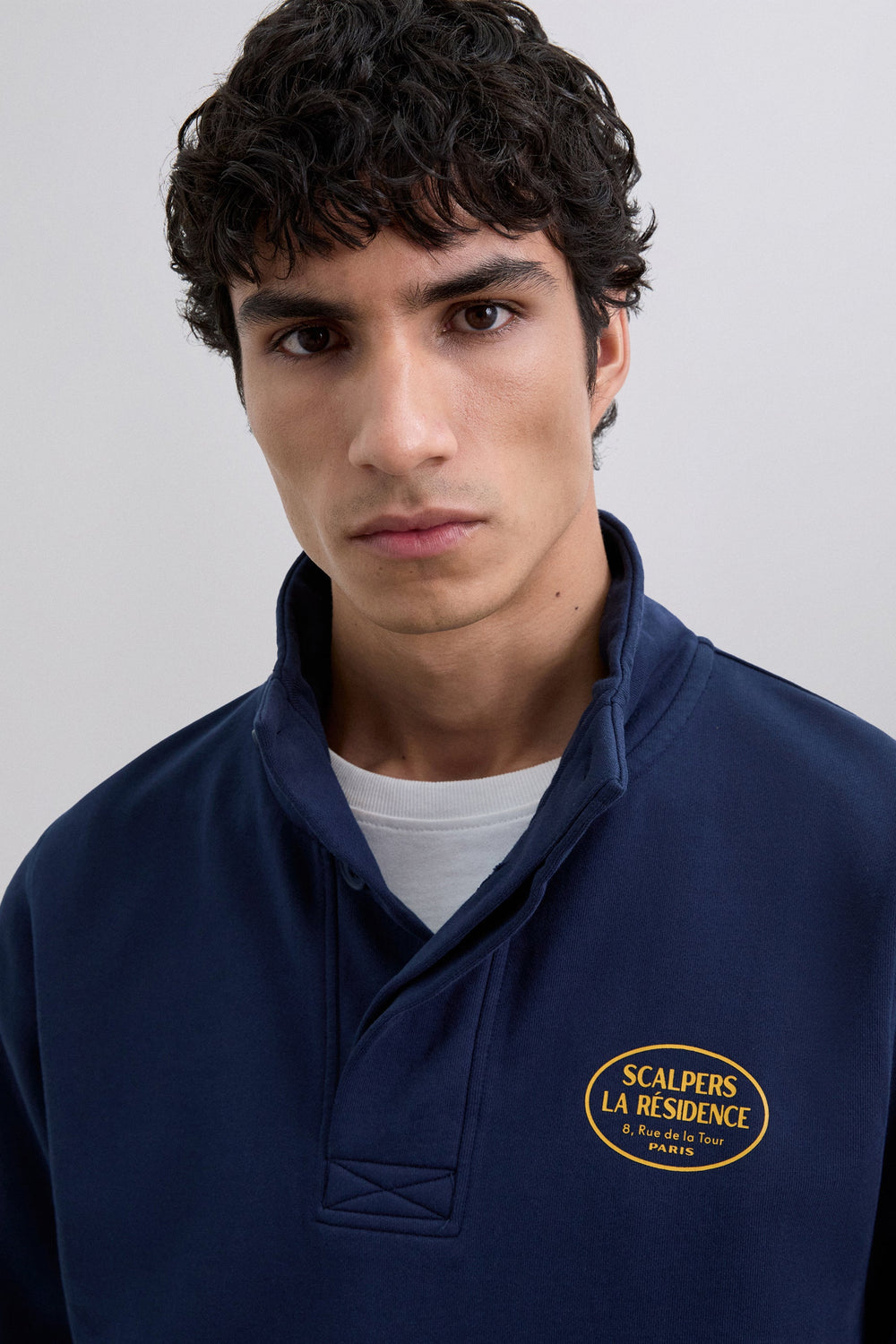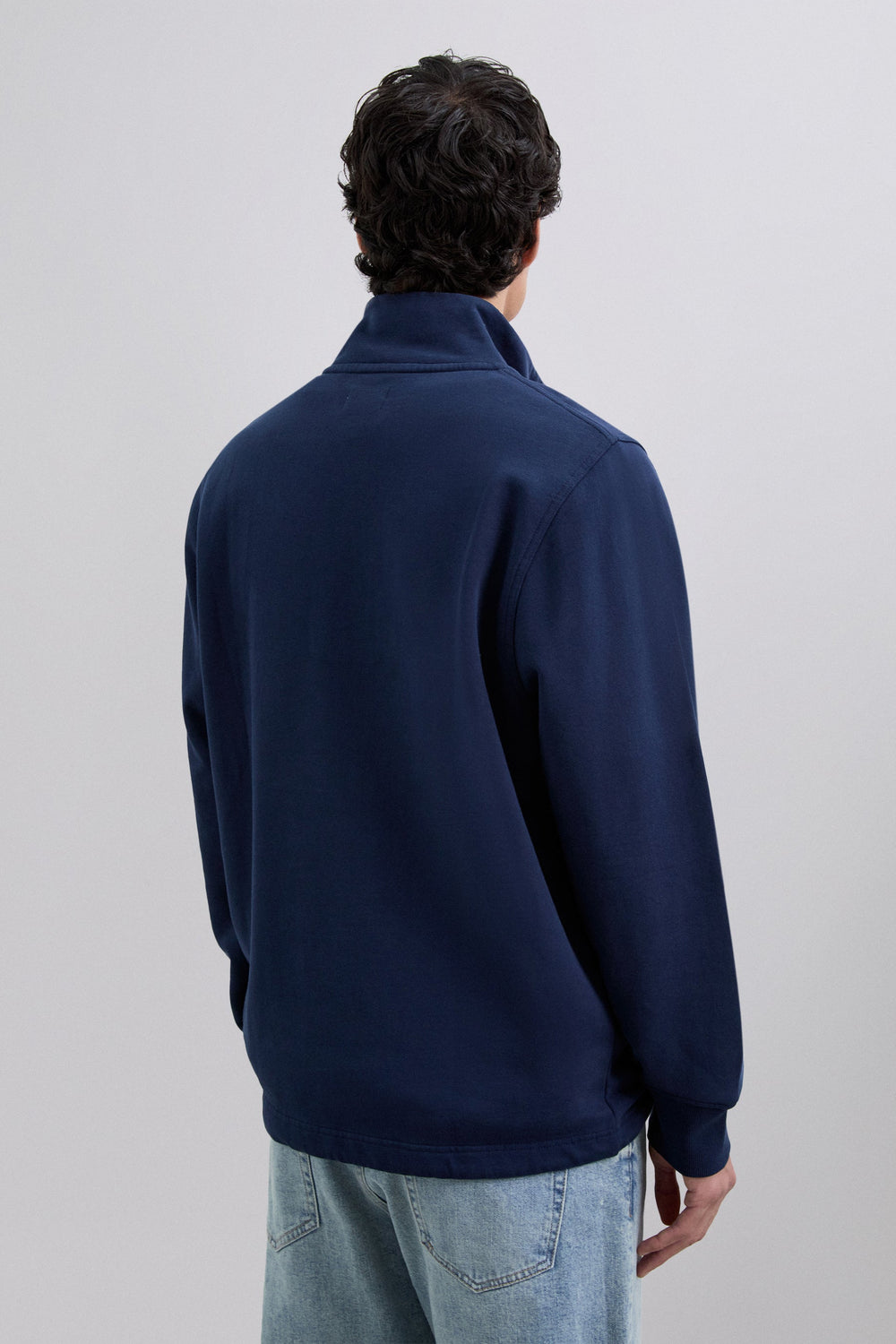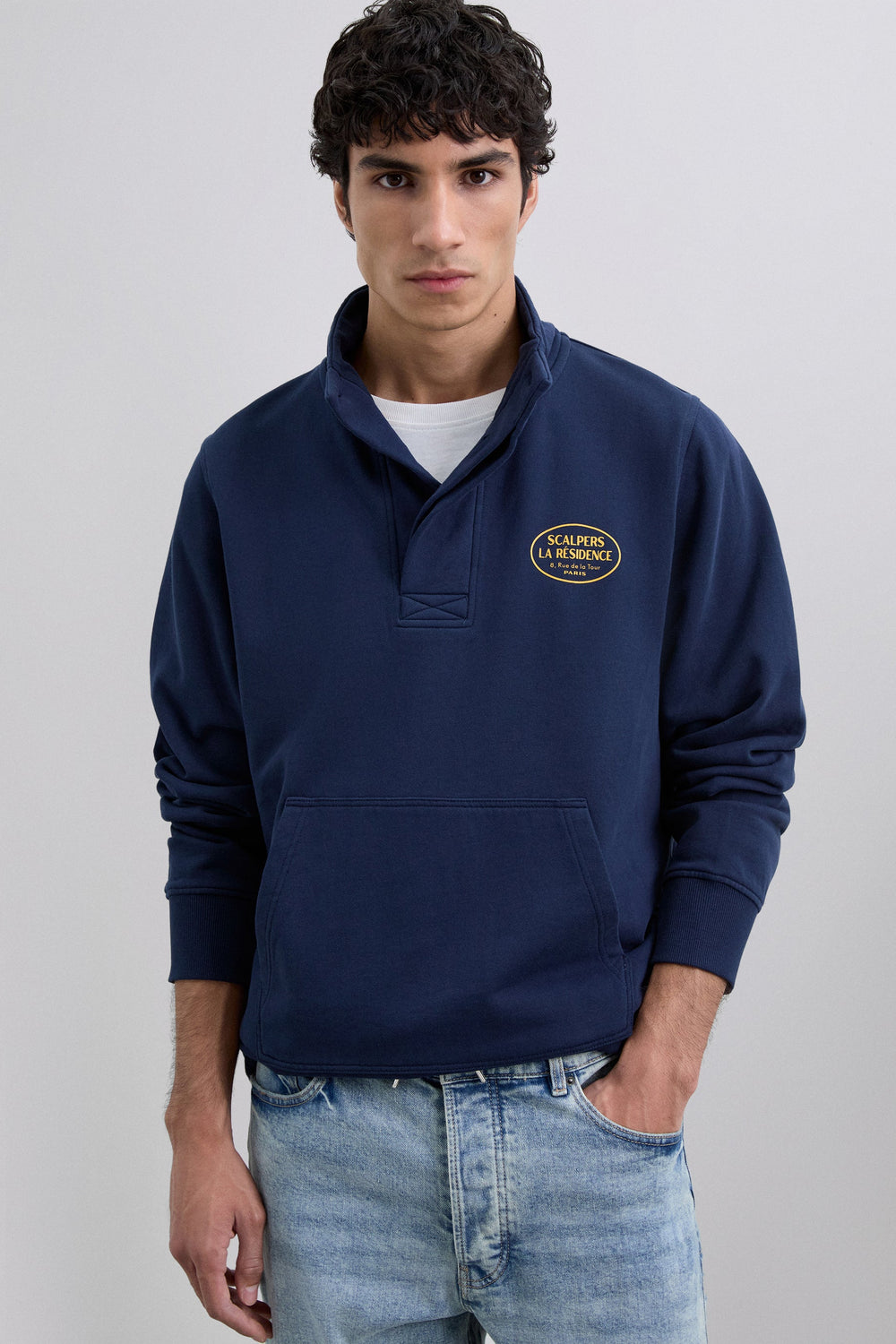 Sweatshirt made of 100% BCI cotton. Long sleeves. High collar and button fastening. Print logo on the chest. Pouch pocket on the front. Adjustable fastening with drawstring at the waist.