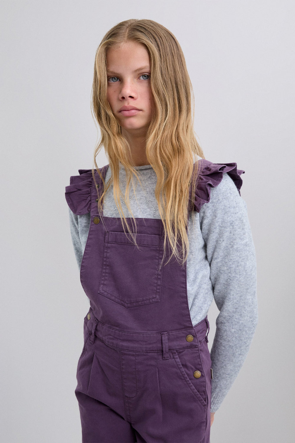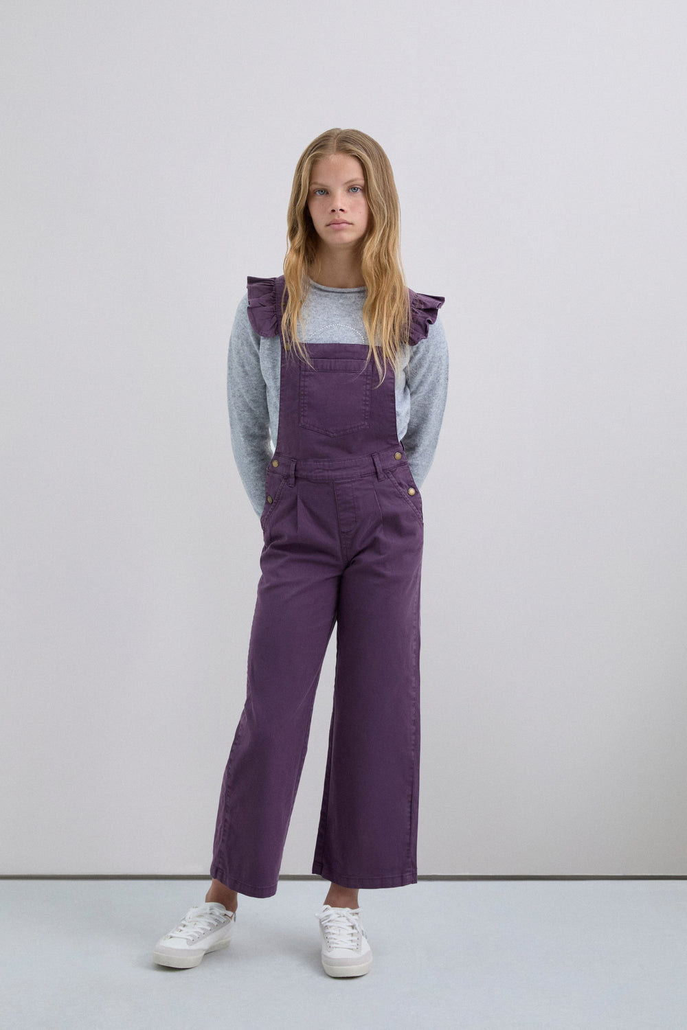 Dungarees made of slightly stretchy cotton. Regular fit with a culotte cut, side button fastenings. Straps with crossed frill on the back and patch pocket on the chest. Side slant pockets and back patch pockets