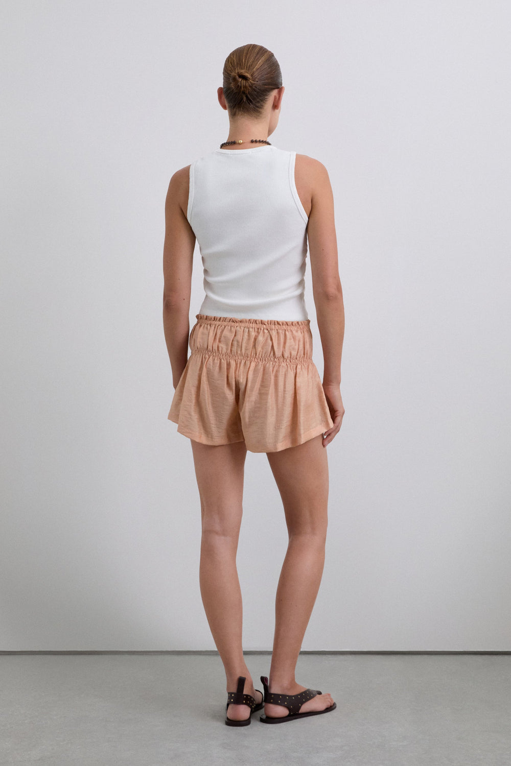 Shorts made of a textured fabric. Slightly stretchy smocked waist.