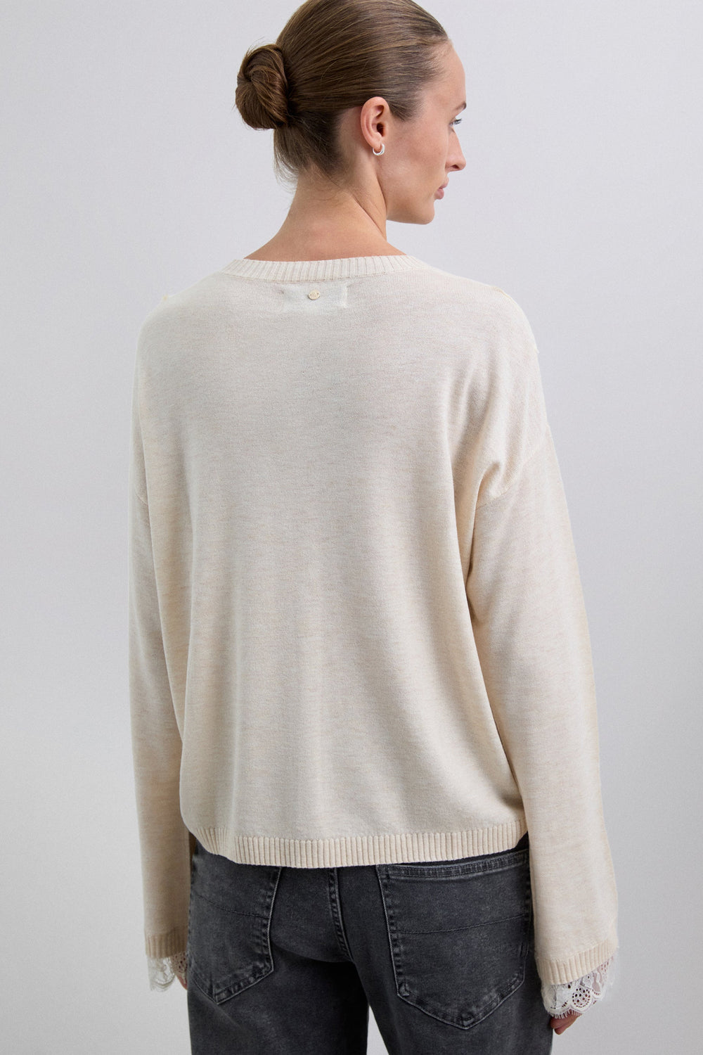 Sweater made of a wool and viscose blend. Regular fit. Round neck and long sleeves with ribbed trim. Lace details on chest and cuffs.