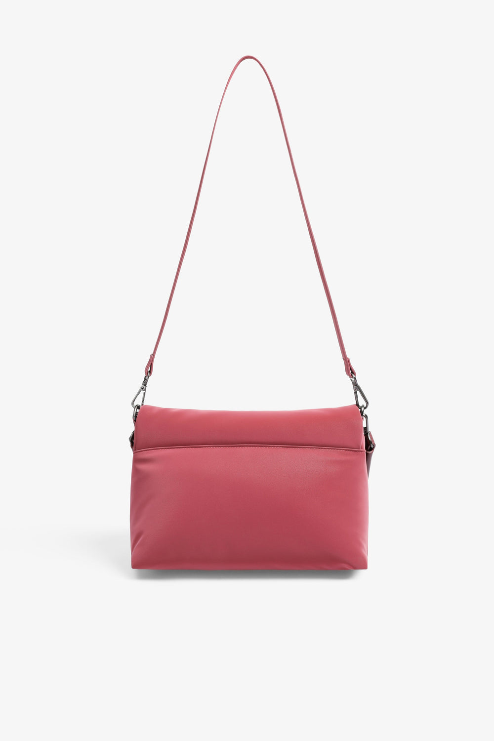 Bag made of polyurethane. Magnetic button fastening. Short braided handle with metallic details and long adjustable strap. Metallic patch with skull on front. Inner lining and pocket with zip closure and logo detail.