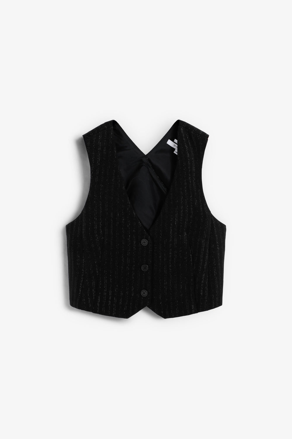Waistcoat made of flowing fabric with lurex stripe print. Slim fit. V-neck. Sleeveless. Crossed back. Button fastening.