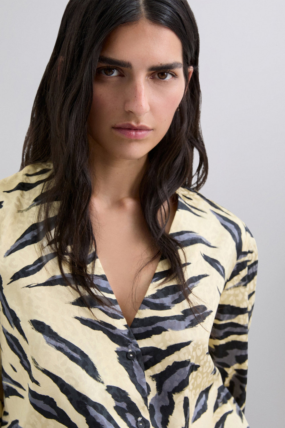 Blouse made from flowing satin fabric with animal print. Regular fit, V-neckline and button fastening. Long lightly puffed sleeves with cuffs.