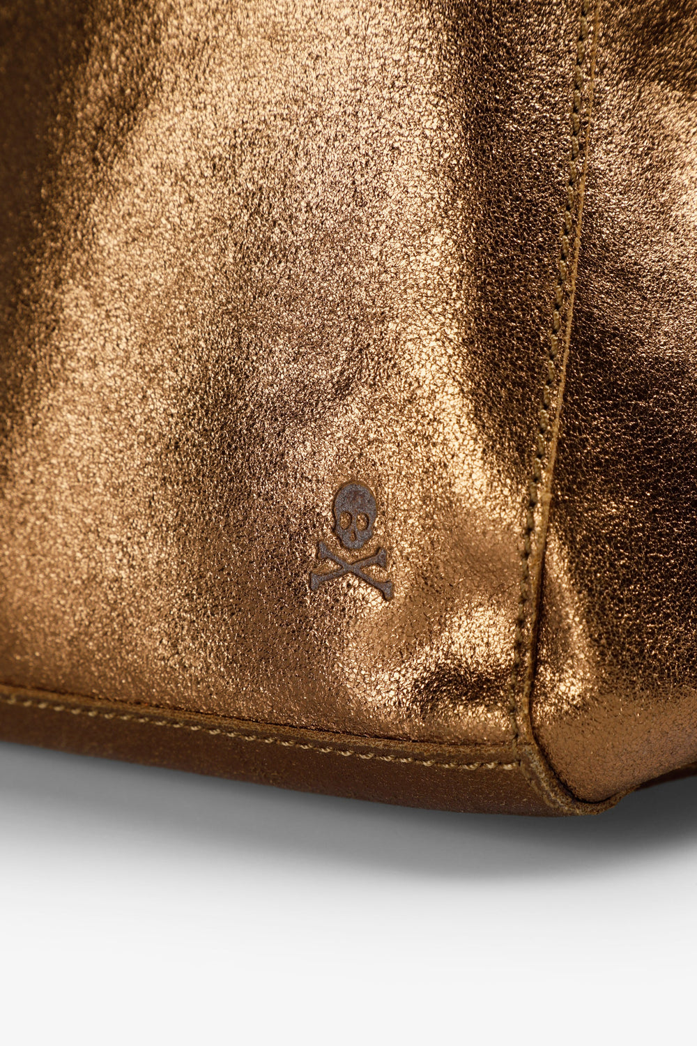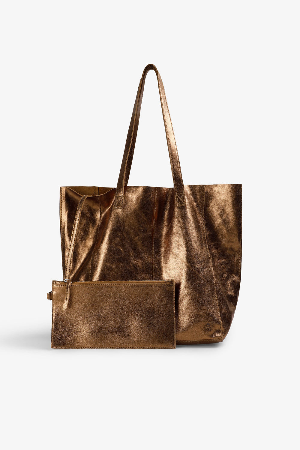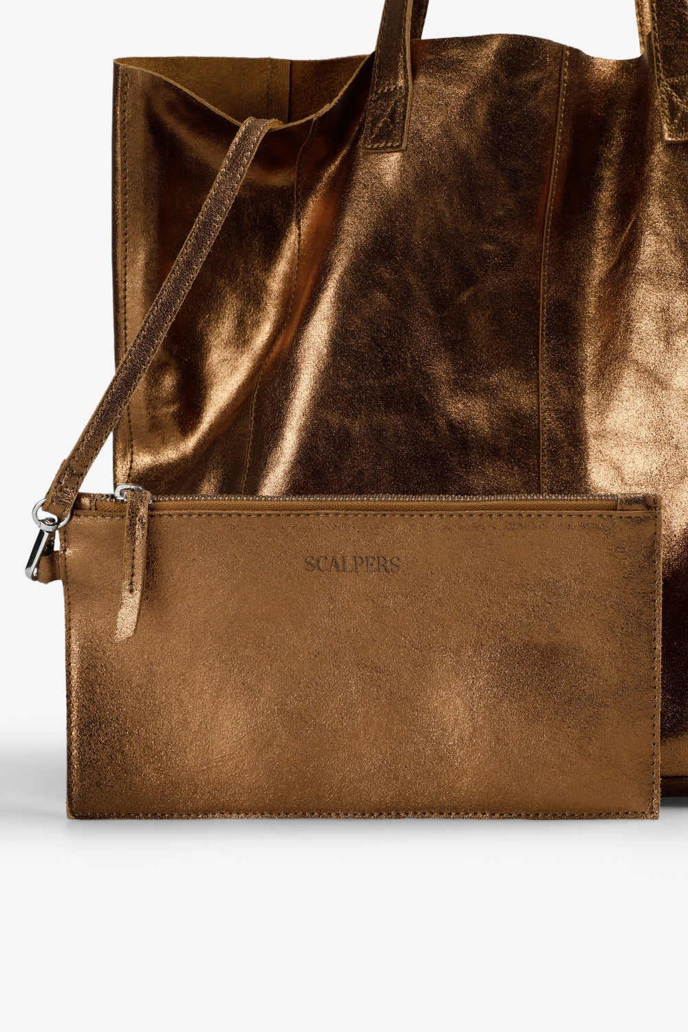 Tote bag made of 100% suede with metallic finish. Reverse side leather inside with matching zip-up wallet.