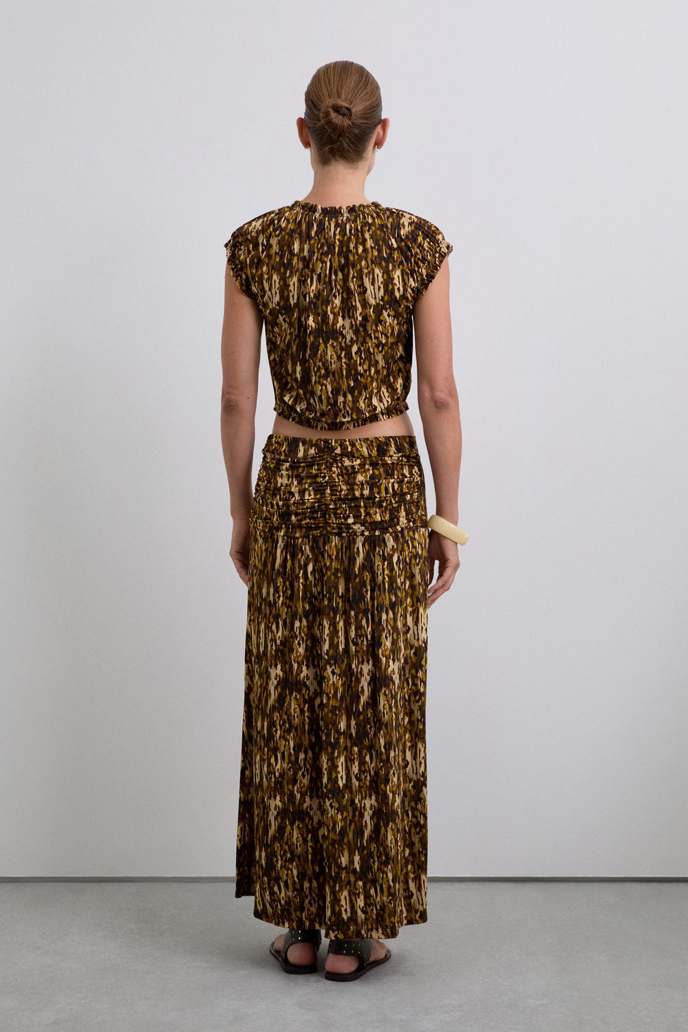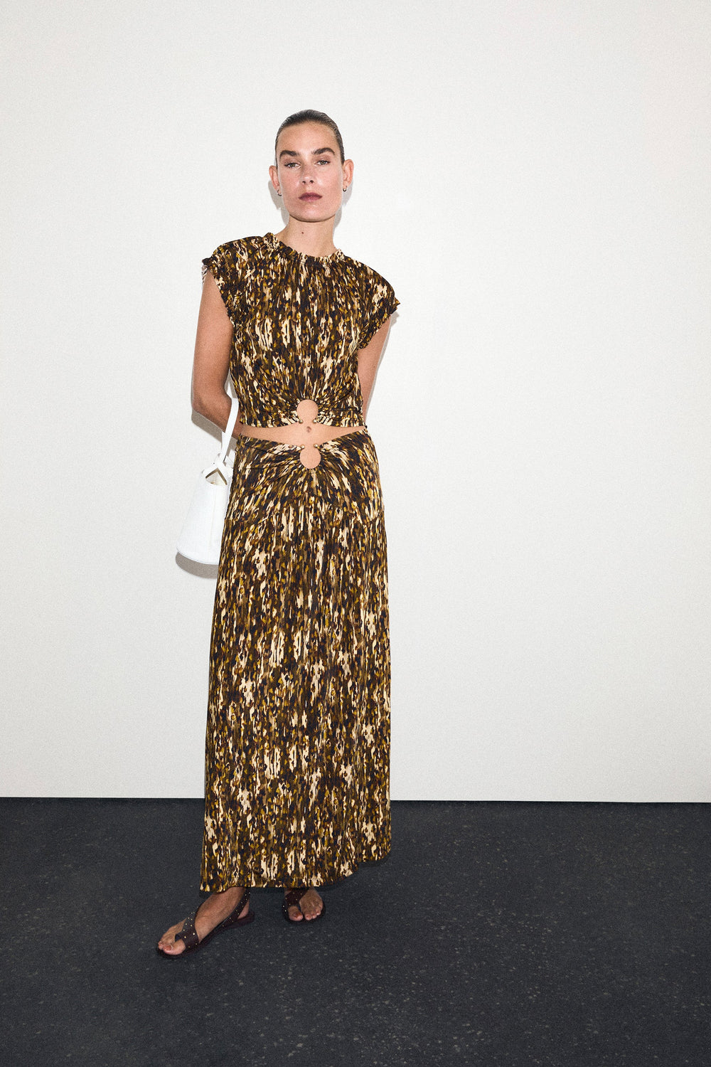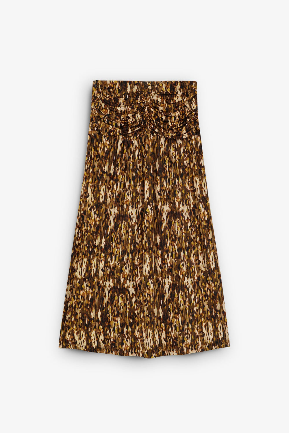 Falda estampada con detalle de hebilla metálica en frontal. Midi. Corte Evasé.
