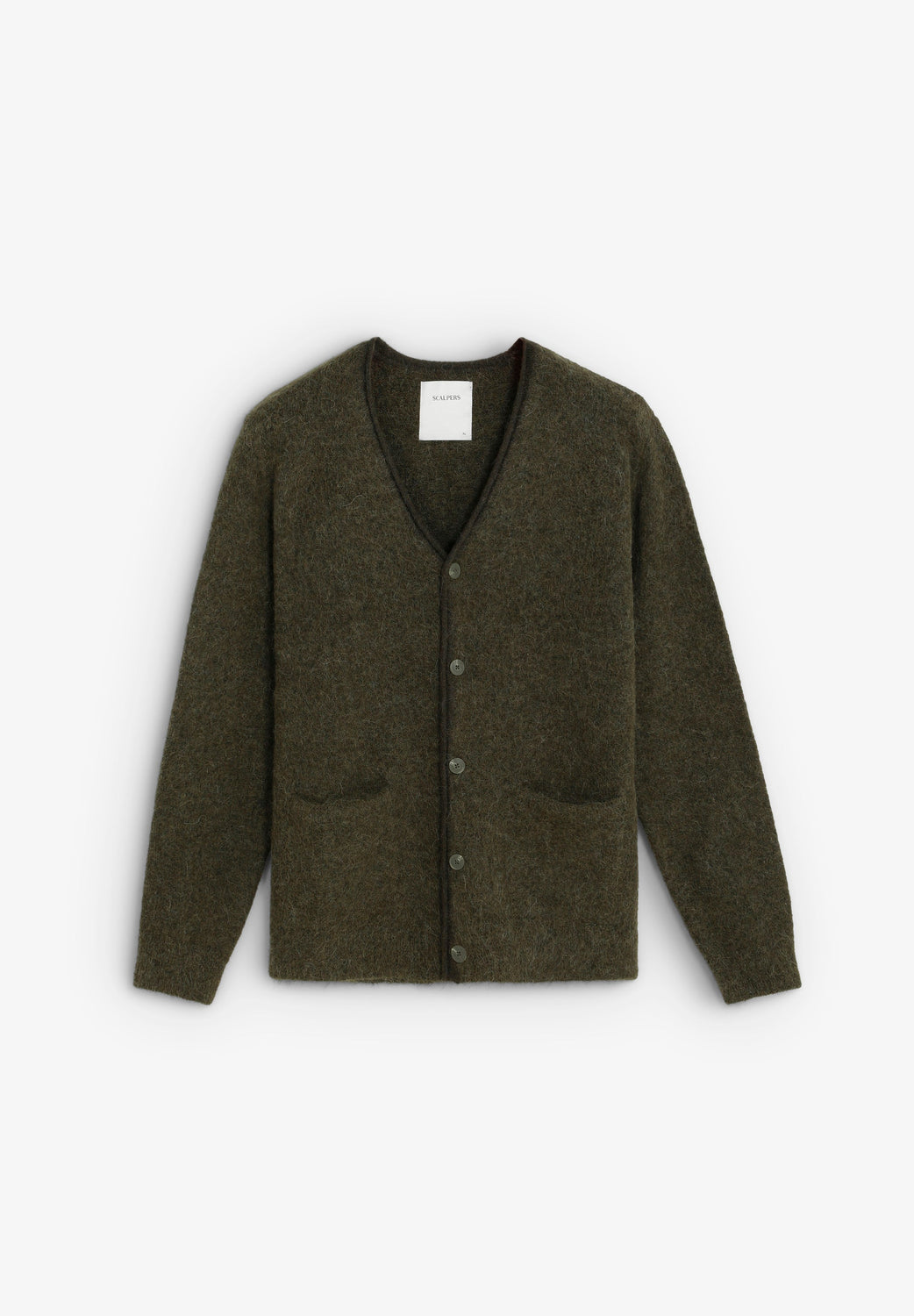 Alpaca cardigan. V-neck. Long sleeves. Front button fastening. Two front pockets. Logo label detail on inside.