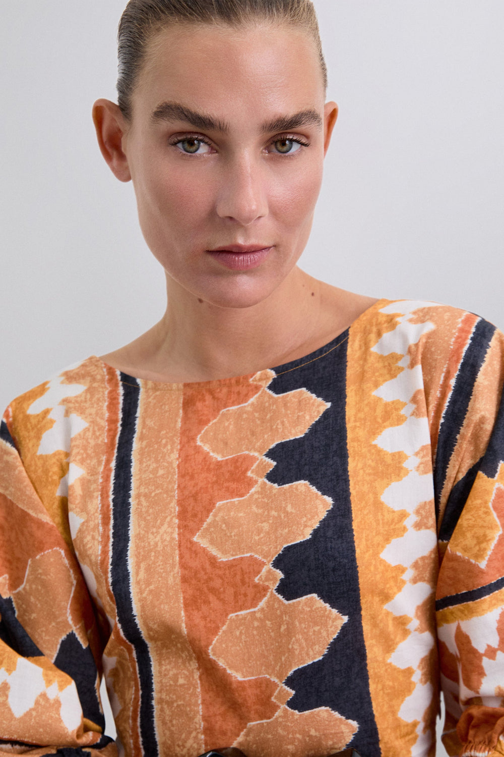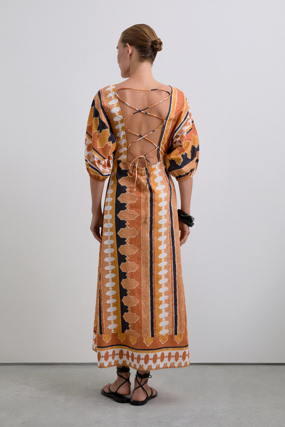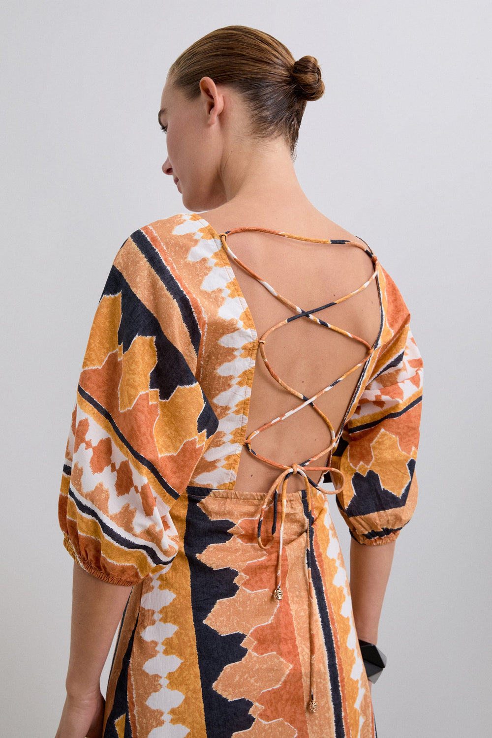 Printed midi dress made of 100% organic BCI cotton. Round neck. Open back with adjustable lace-up fastening. Short puffed sleeves. Gathered cuff detailing.