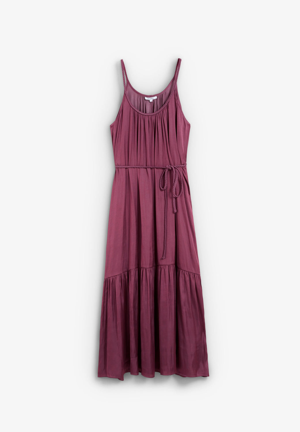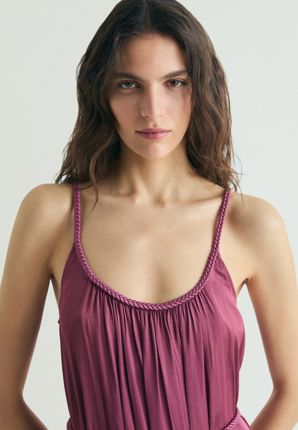 Flowing midi dress with straps. Round neck. Braided detailing on neckline and waist. Gathered ruffle on the hem.