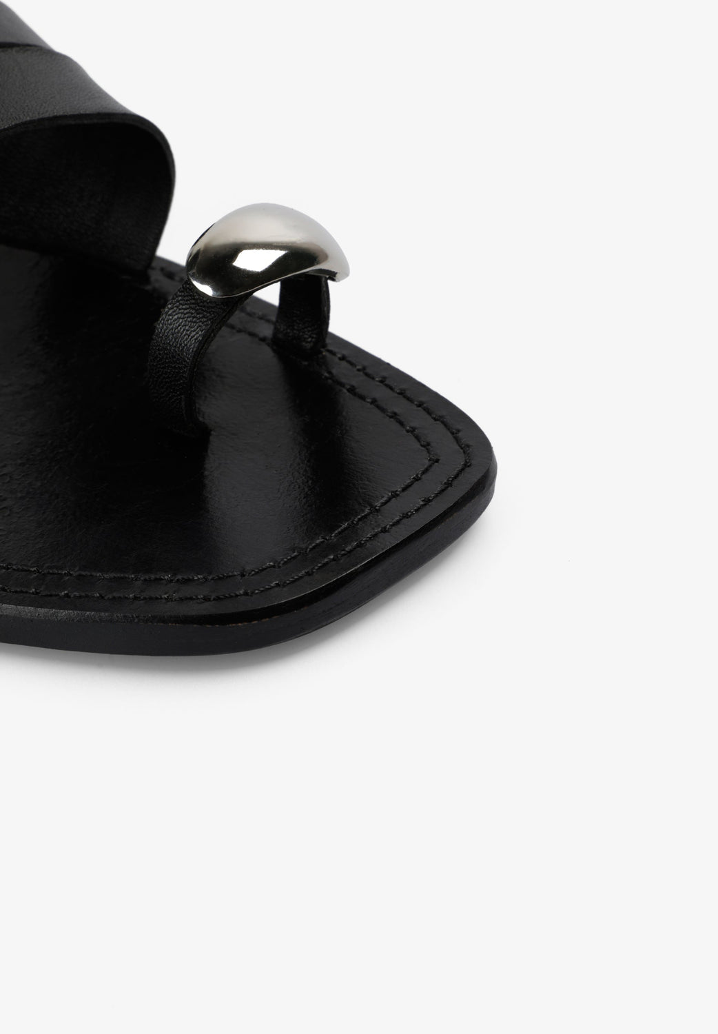 100% leather flat sandal with straps. Metal trim detail on the toe.