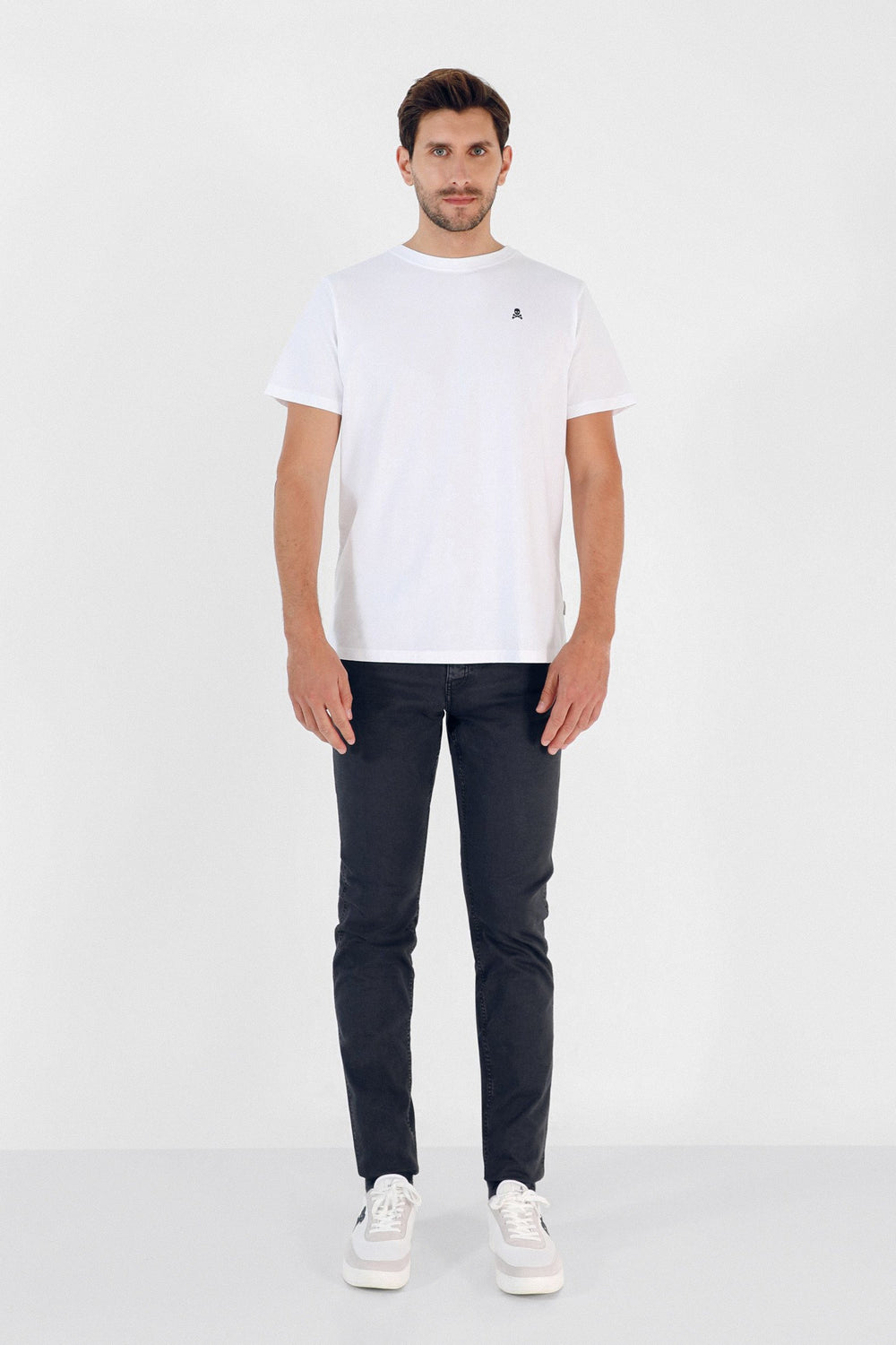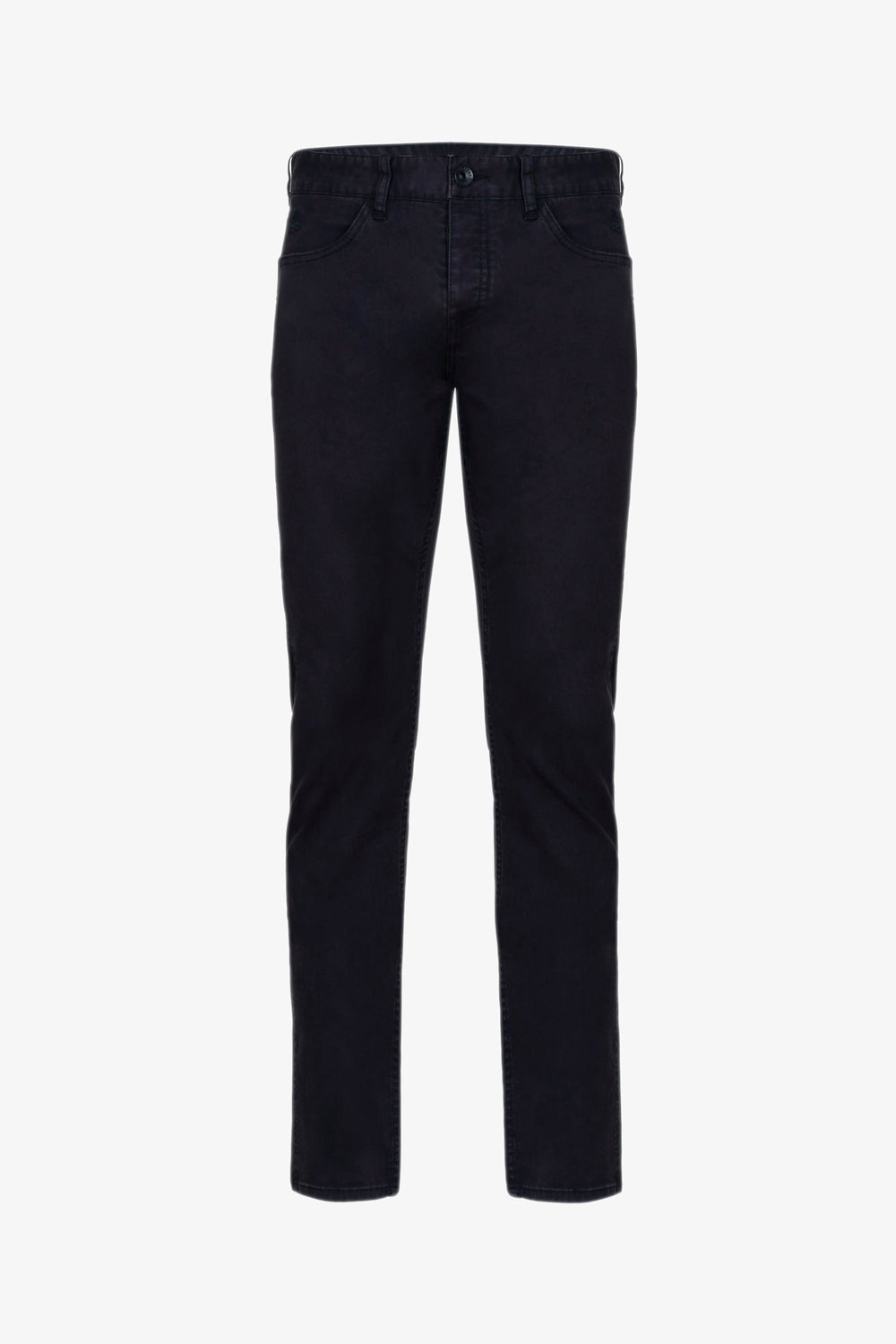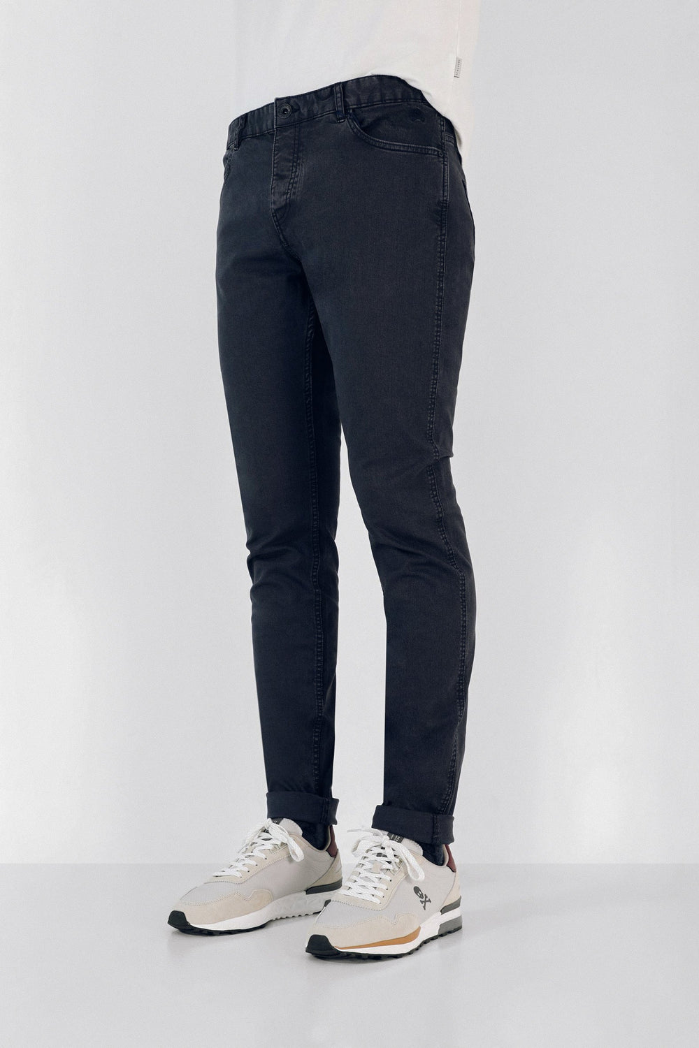 Pantalon en coton teint en plongée. Coupe slim, fermeture boutonnée et fermeture éclair. Cinq poches et passants. Logo brodé sur la poche.