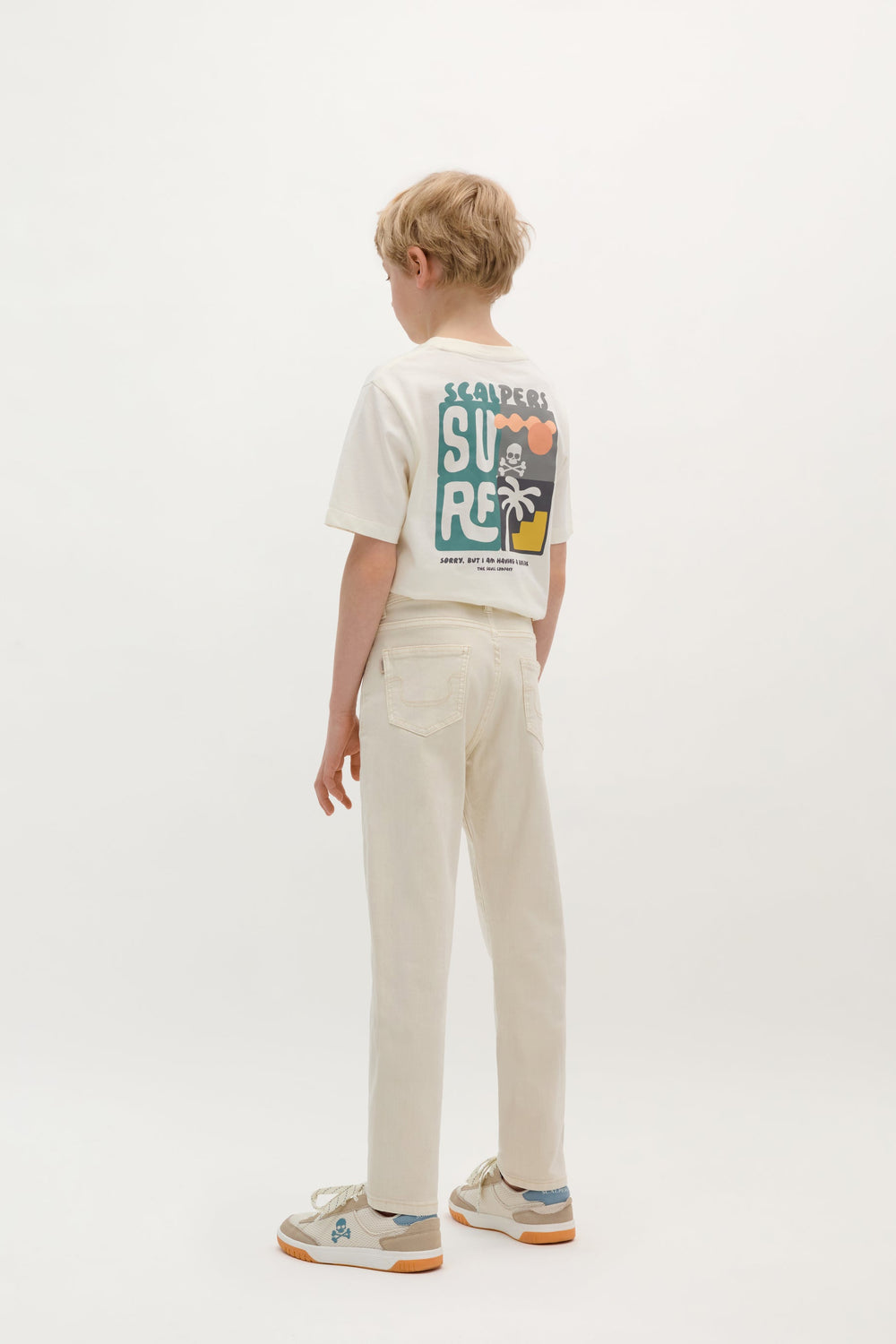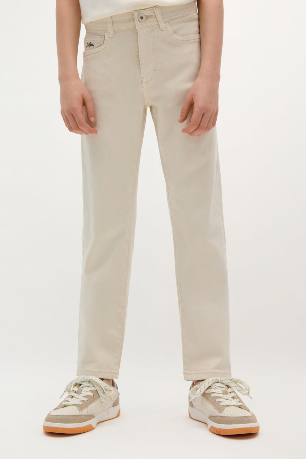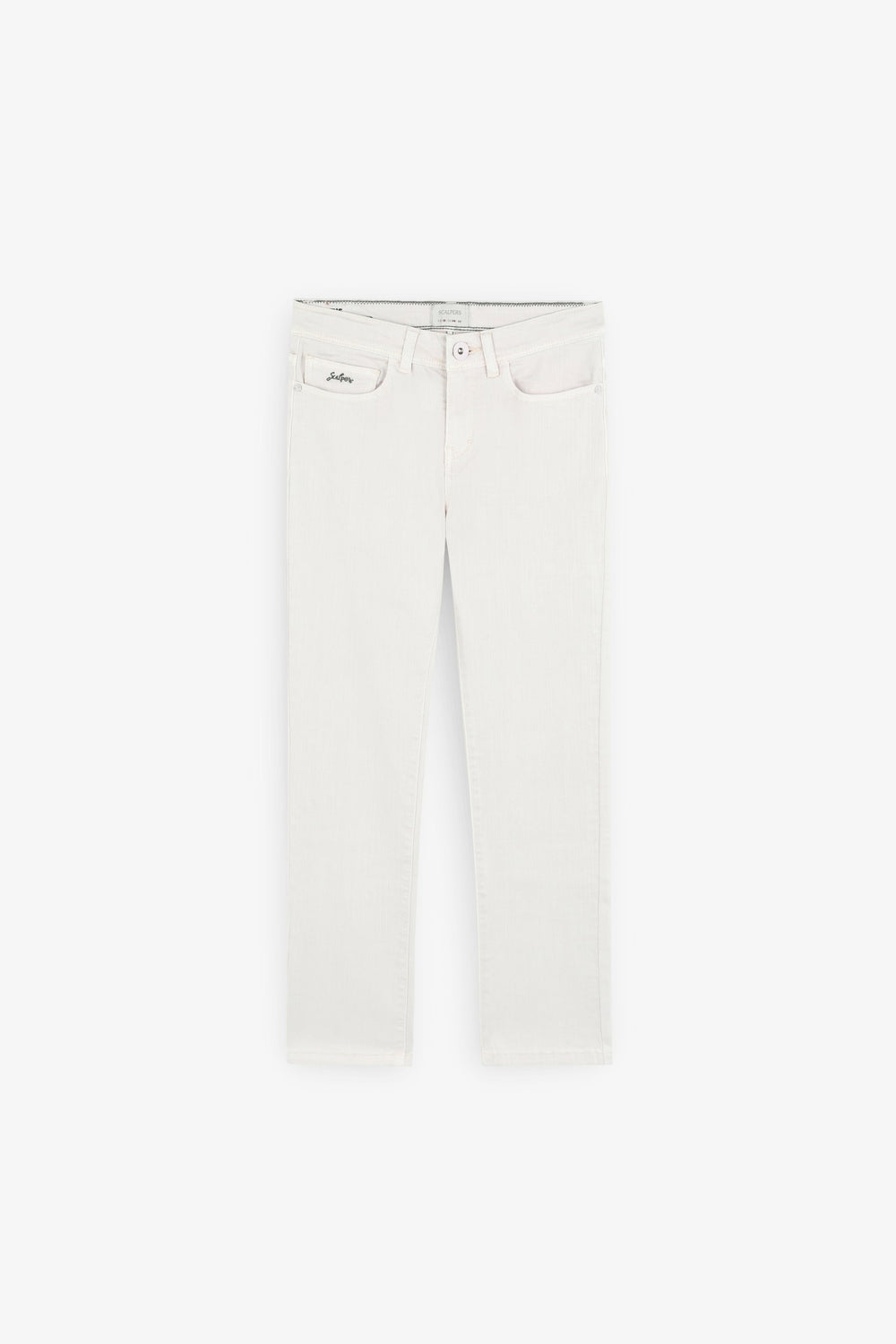 Pantalon confectionné en coton légèrement extensible. Coupe droite, fermeture boutonnée et poches sur les côtés et à l’arrière. Passants de ceinture et logo brodé.