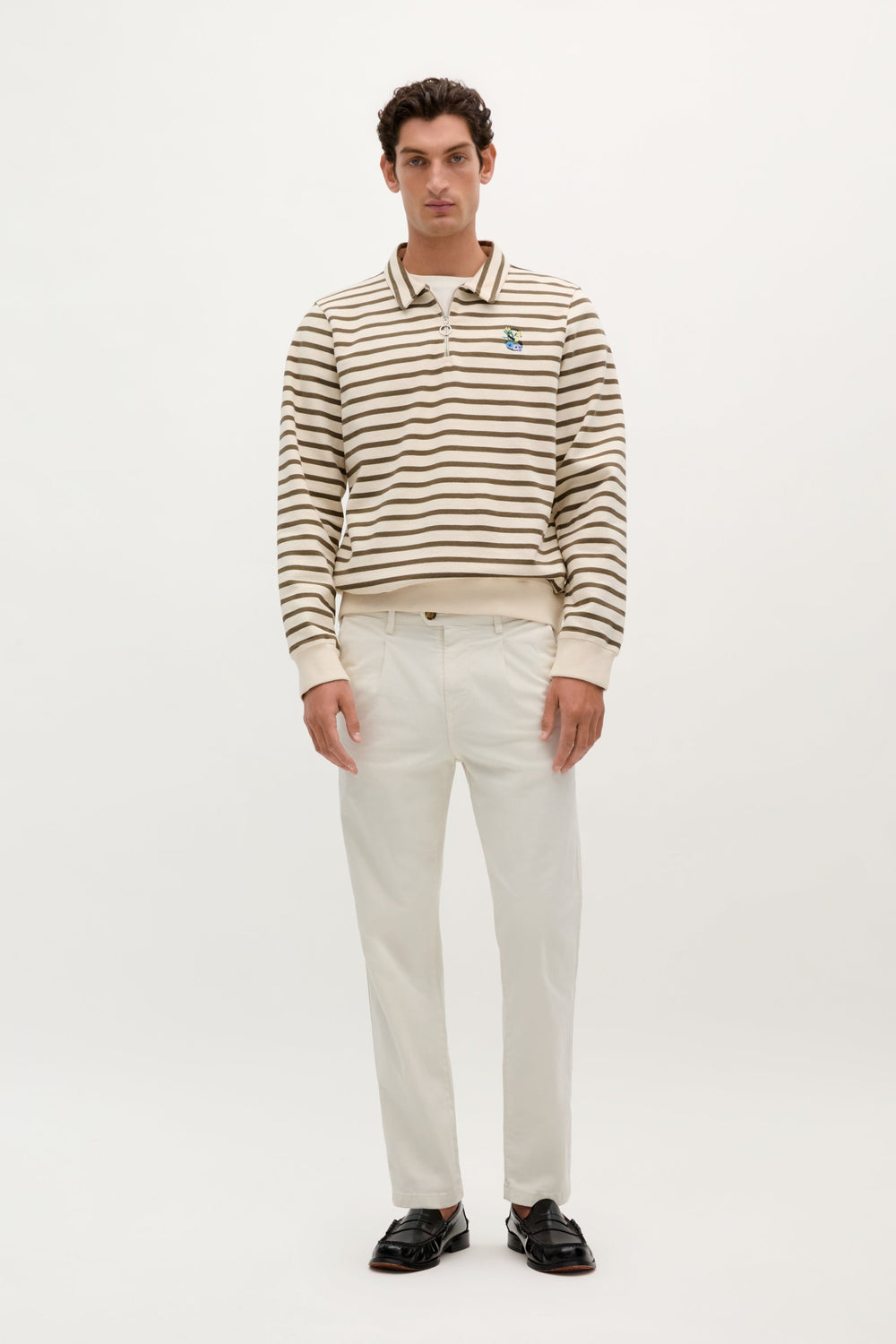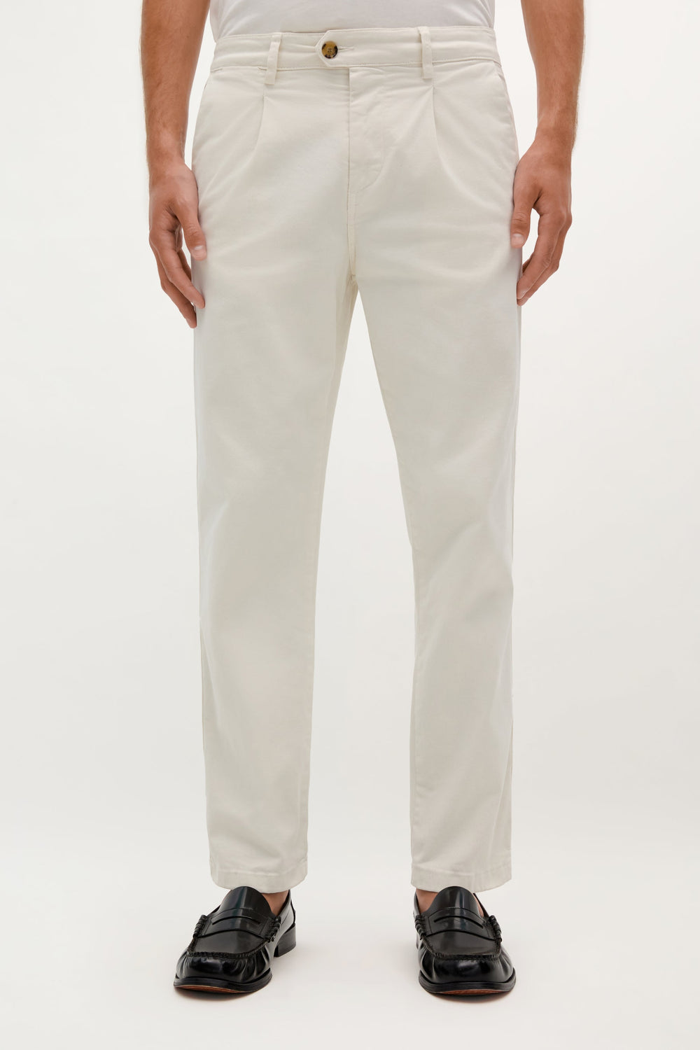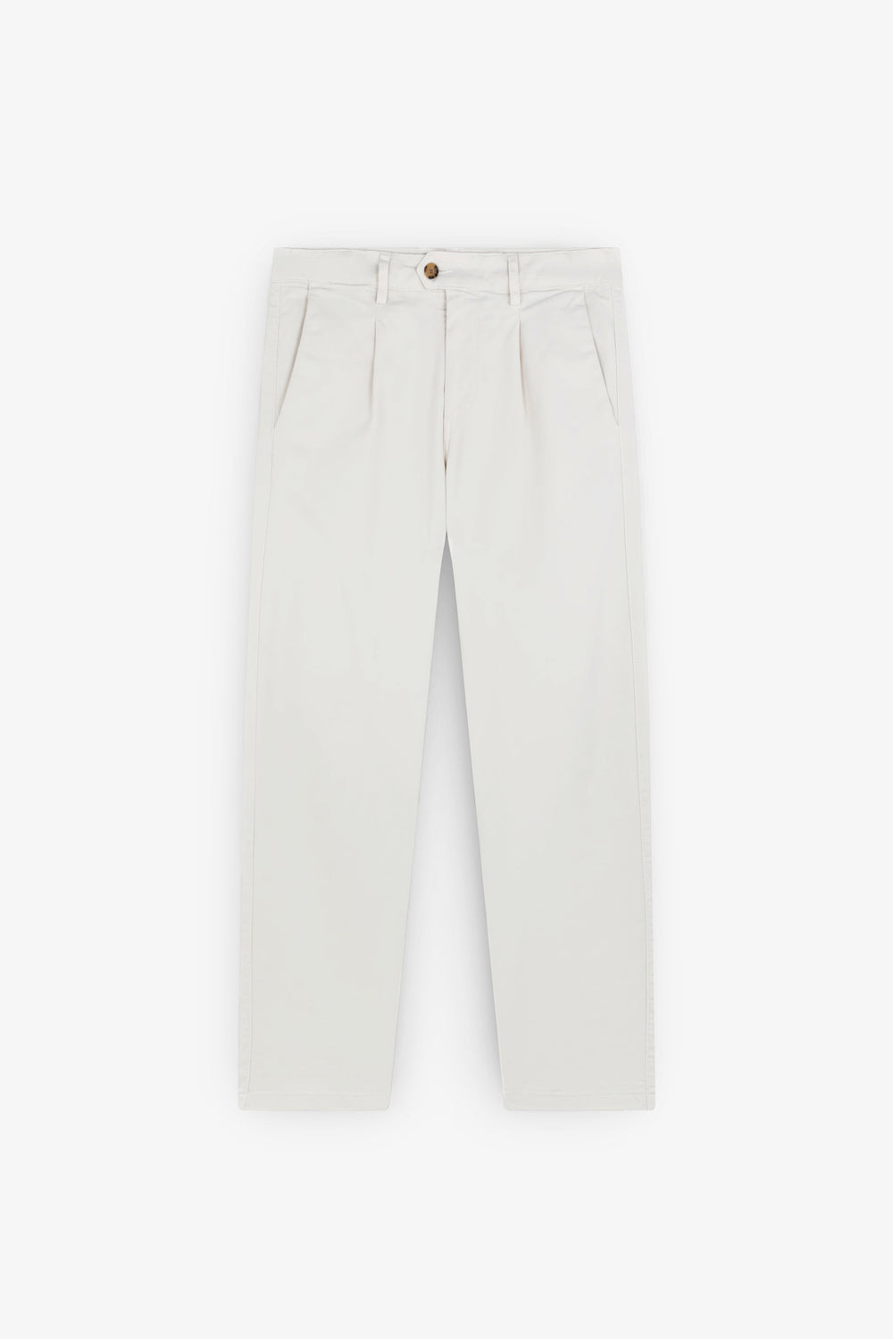 Pantalon chino confectionné dans un mélange de coton BCI légèrement extensible. Coupe droite à pinces, bouton et fermeture Éclair, poches sur les côtés. Passants de ceinture.
