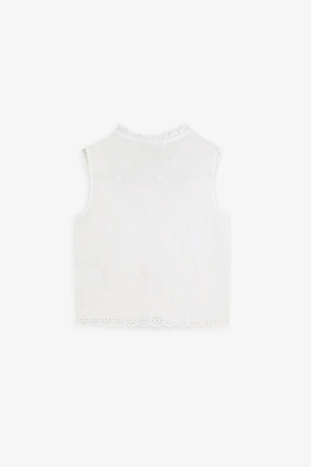 100 % coton BCI. Coupe droite, col rond à volant et broderie suisse en V sur la poitrine. Boutons, emmanchures américaines, broderie dans le bas, et pièce en métal avec logo.