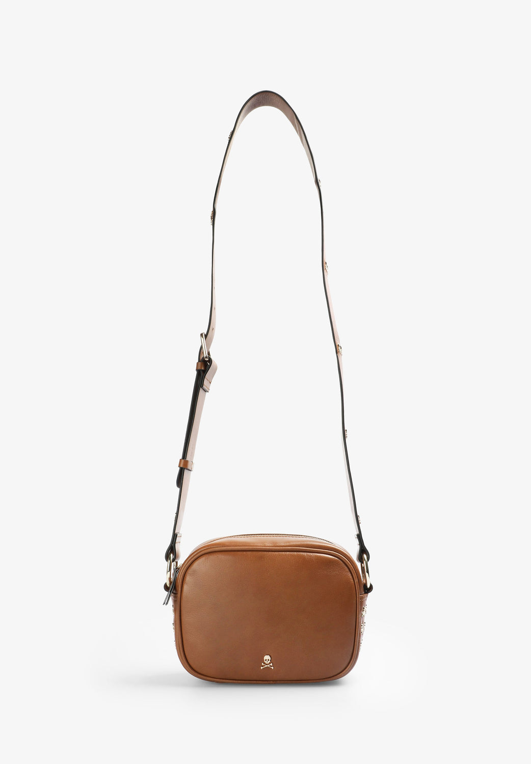 Sac à bandoulière 100 % cuir. Fermeture éclair, bandoulière ajustable et skulls métalliques Logo métallique.