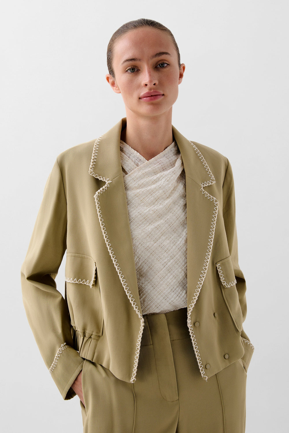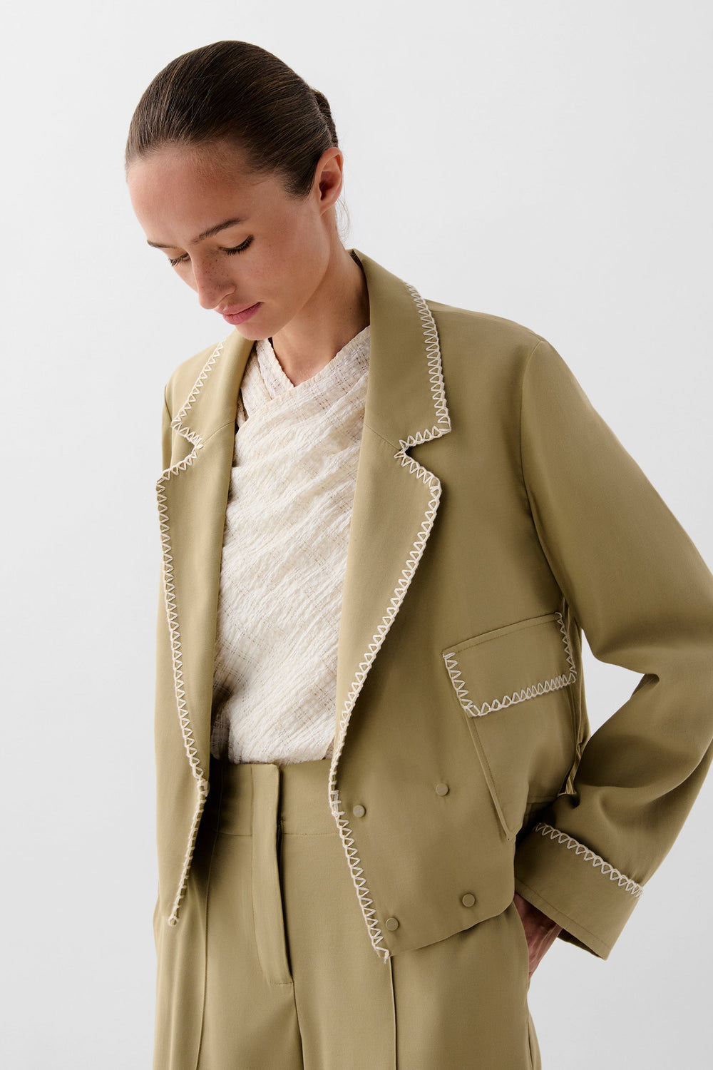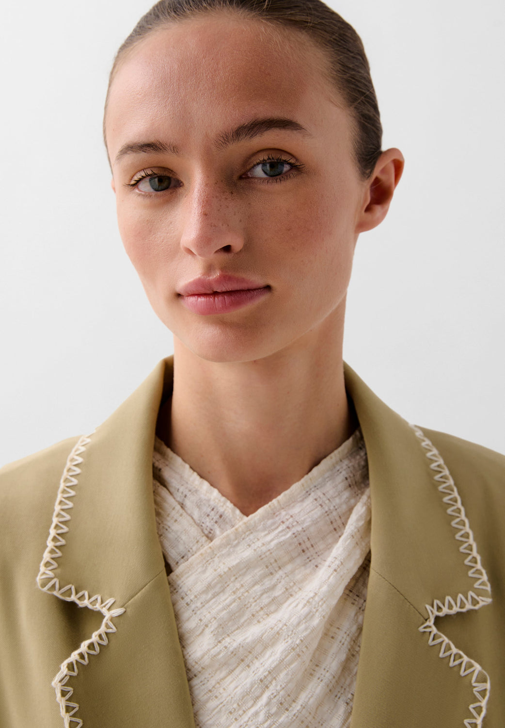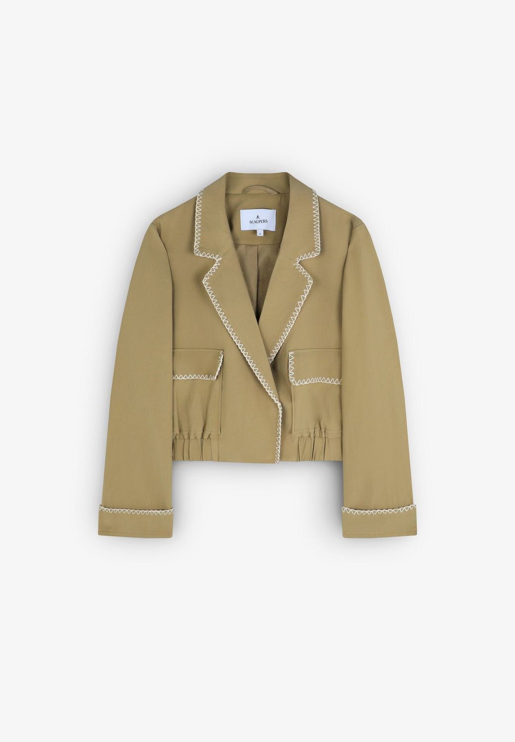 Blazer avec coutures contrastantes. Confectionné dans un mélange de coton toucher velours. Coupe droite. Col à revers. Boutonnage croisé. Manches longues. Poches à rabat.