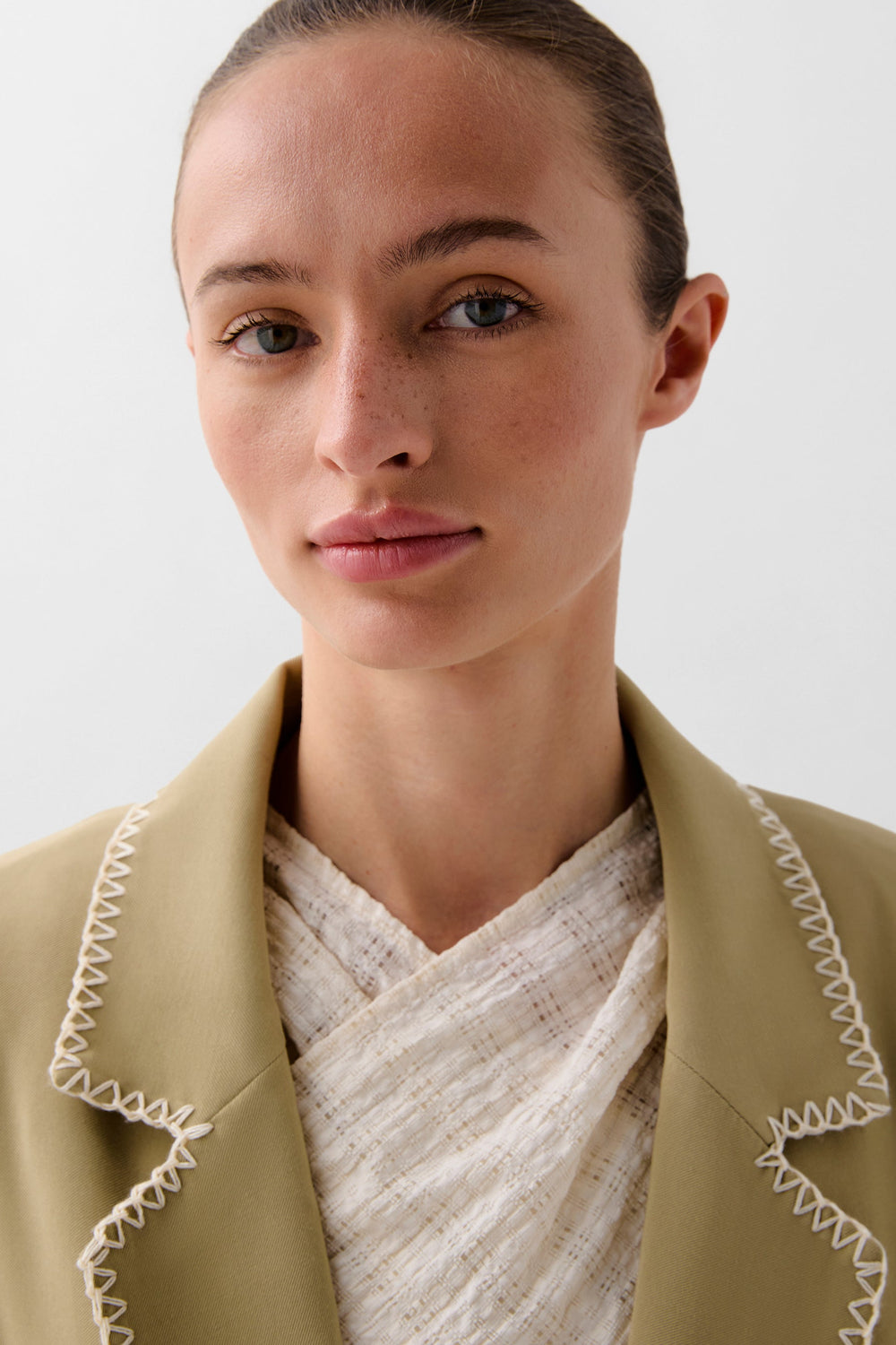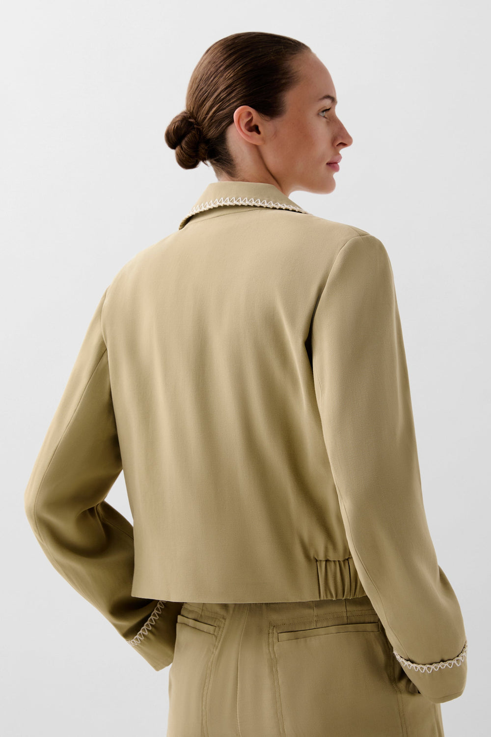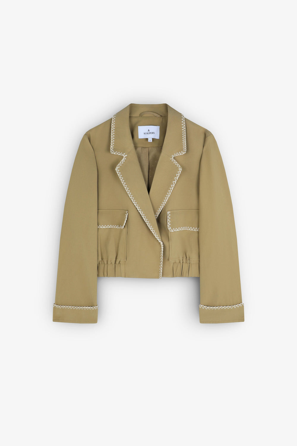 Blazer avec coutures contrastantes. Confectionné dans un mélange de coton toucher velours. Coupe droite. Col à revers. Boutonnage croisé. Manches longues. Poches à rabat.