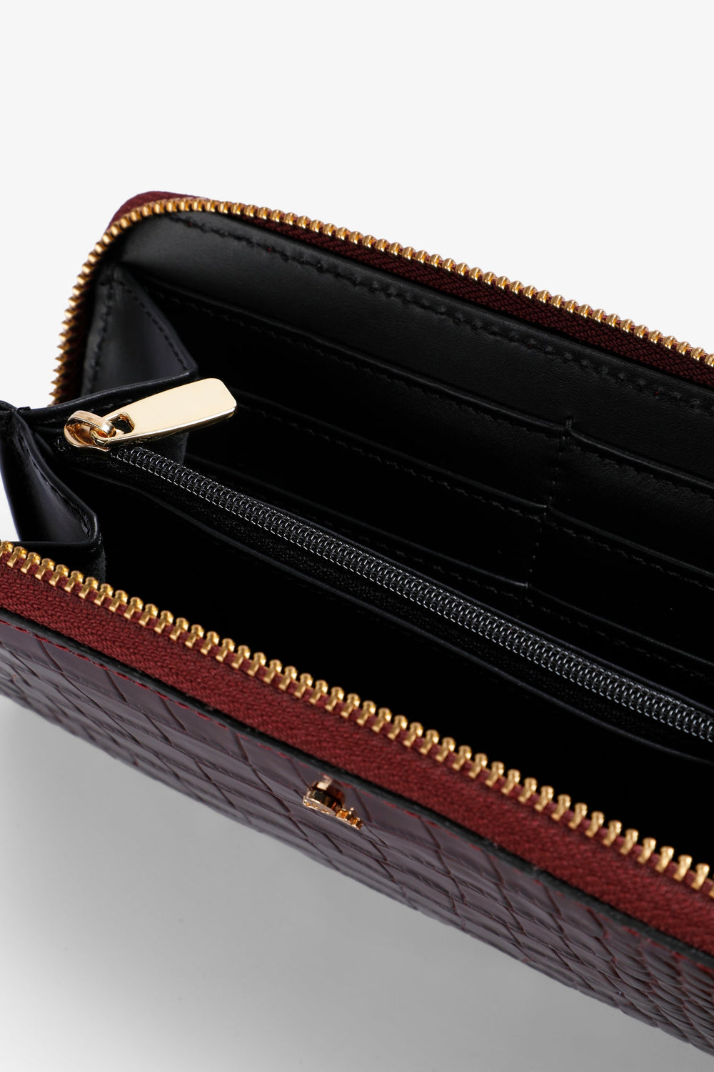 Portefeuille 100 % cuir texture imprimé motif animal. Intérieur avec porte-cartes et poche avec fermeture éclair. Fermeture éclair et logo métallisé devant.