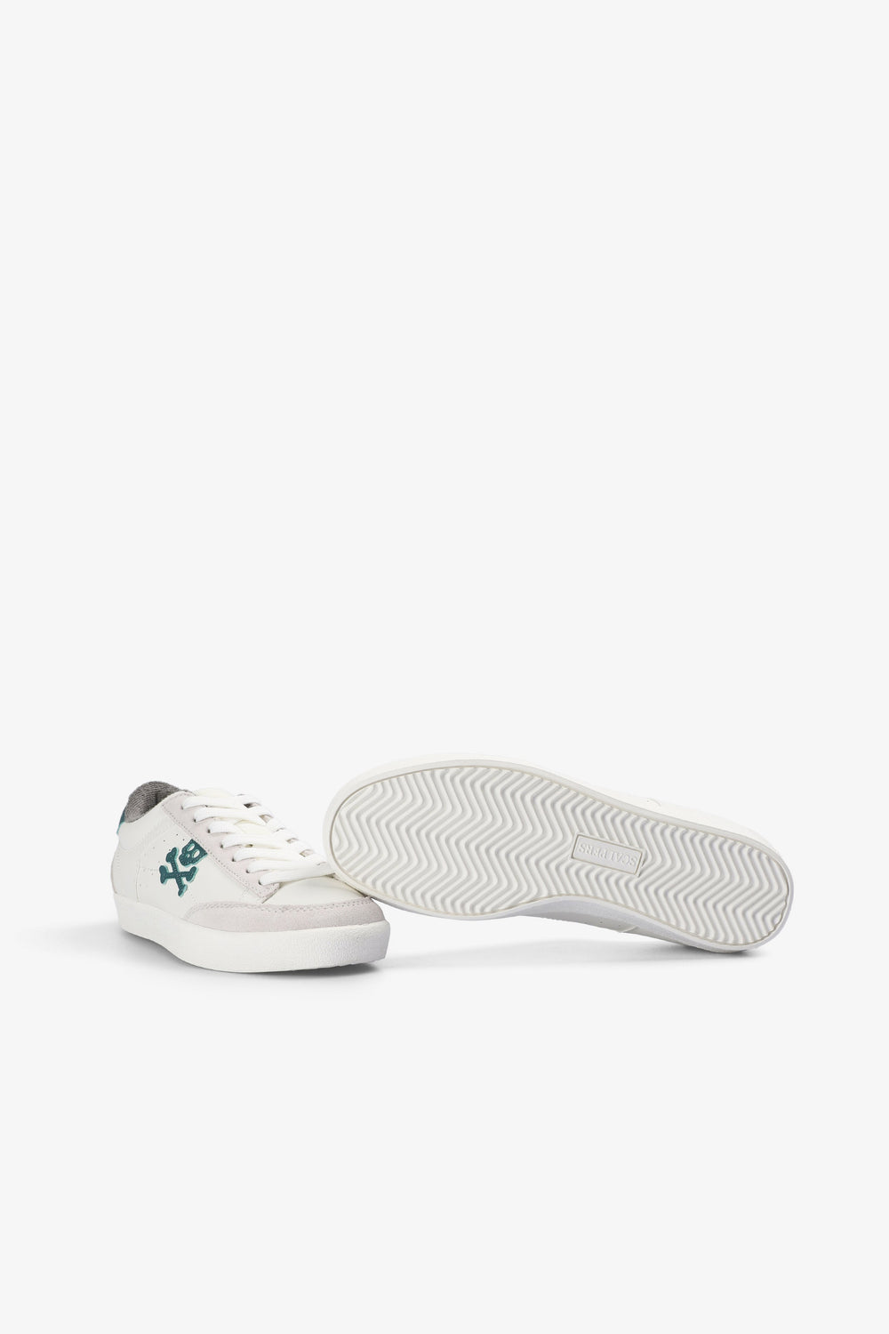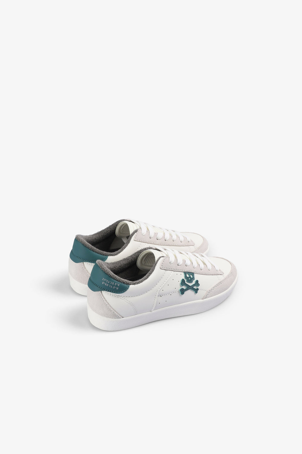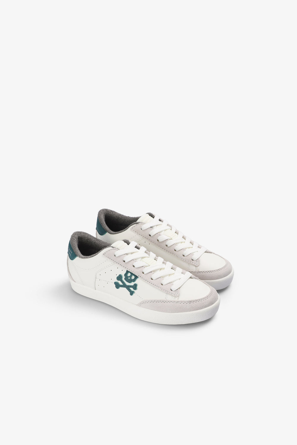 Tennis basses avec skull contrastant sur le côté. Lacets. Semelle en caoutchouc effet usé. Détail contrastant sur le talon.