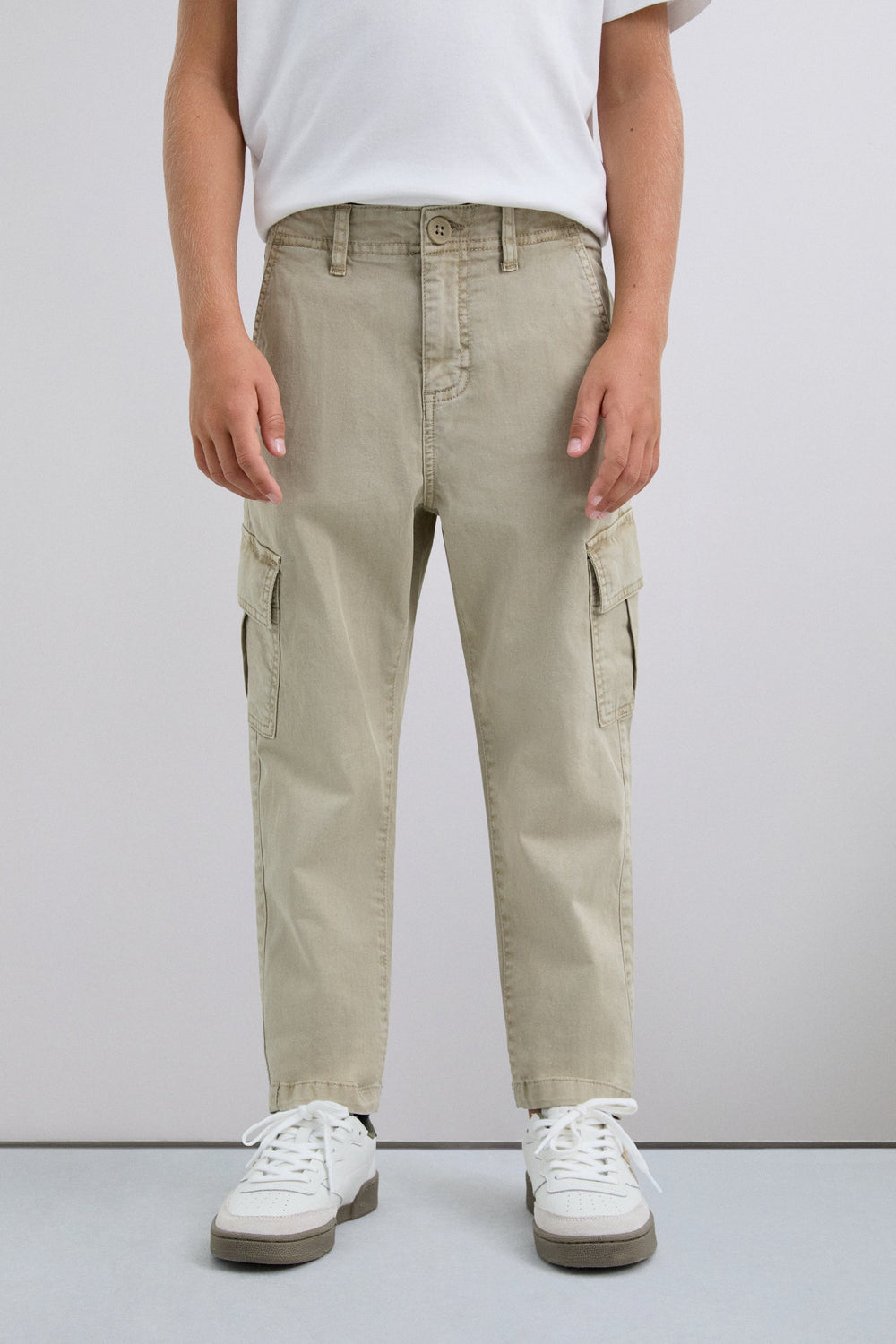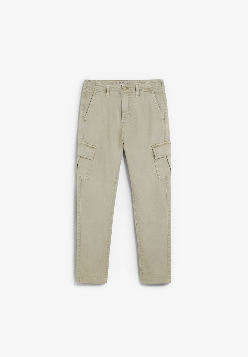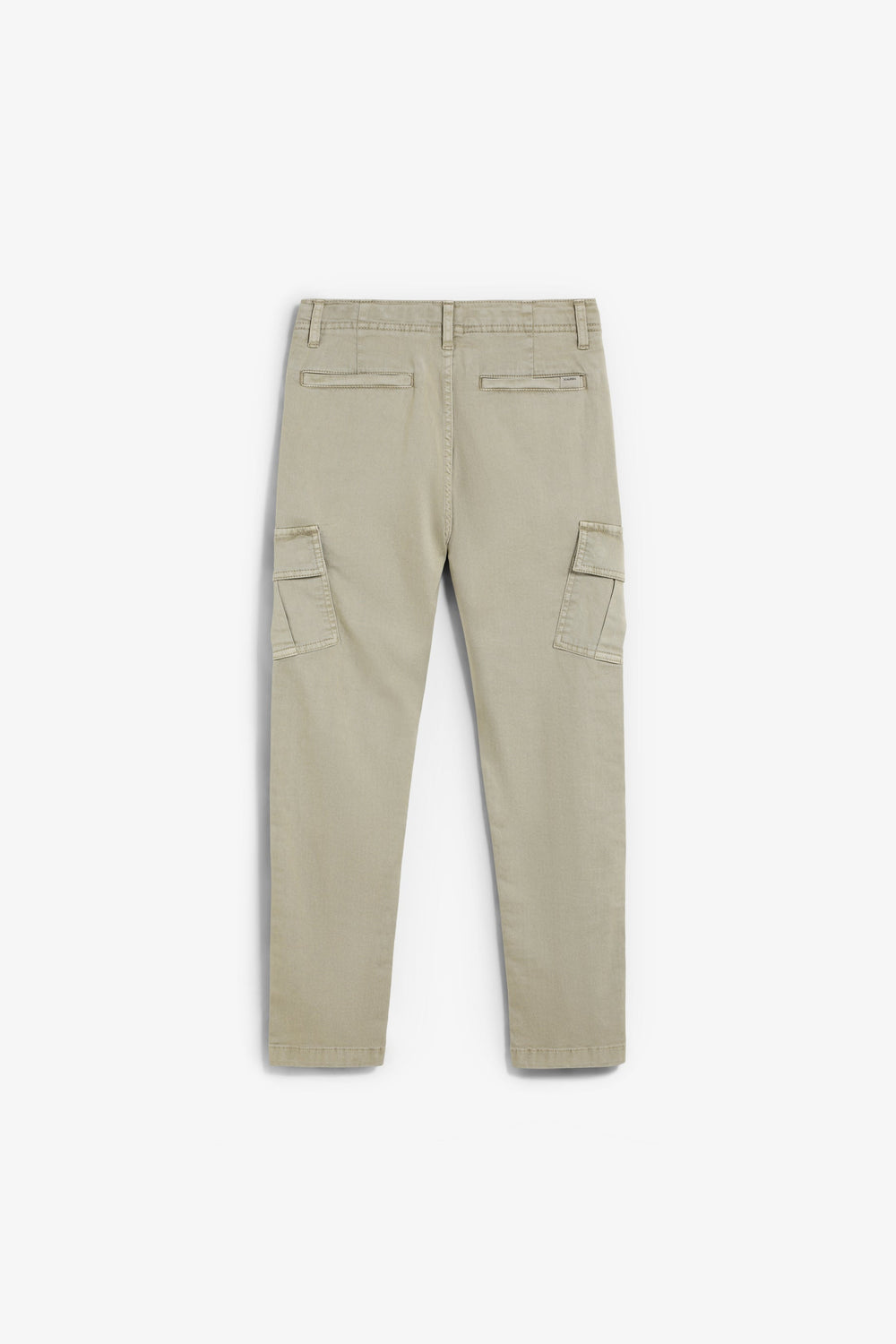 Pantalon cargo confectionné en coton BCI légèrement extensible. Coupe droite, bouton et fermeture éclair, poches sur les côtés. Passants de ceinture et poches à rabat sur les jambes.