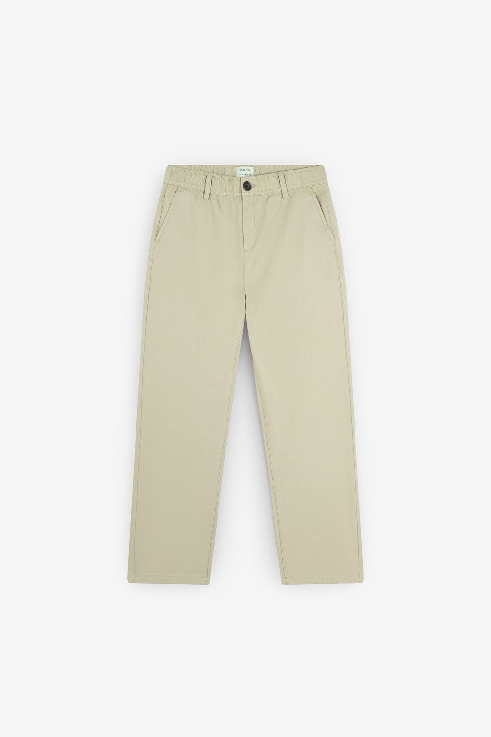 Pantalon chino 100 % coton BCI. Deux poches devant et derrière. Bouton et passants de ceinture. Étiquette avec logo sur la poche.