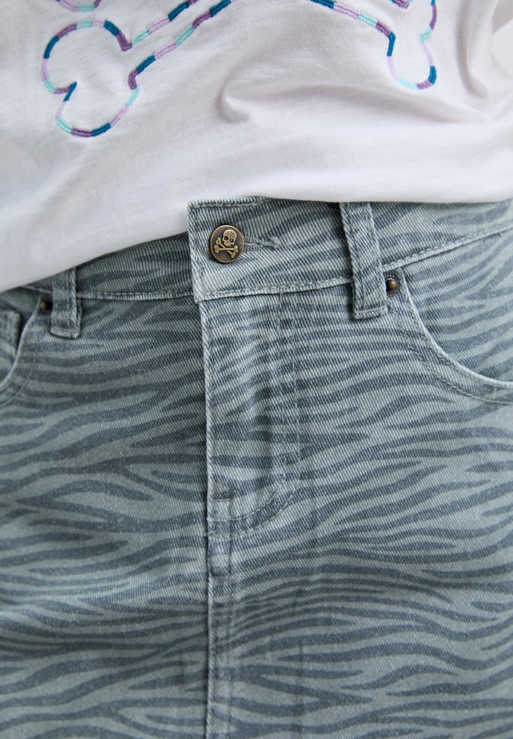 Mini-jupe composée à 98 % de coton biologique BCI. Bouton et fermeture Éclair sur le devant. Poches à l’avant et à l’arrière. Imprimé zèbre. Étiquette à l’arrière.
