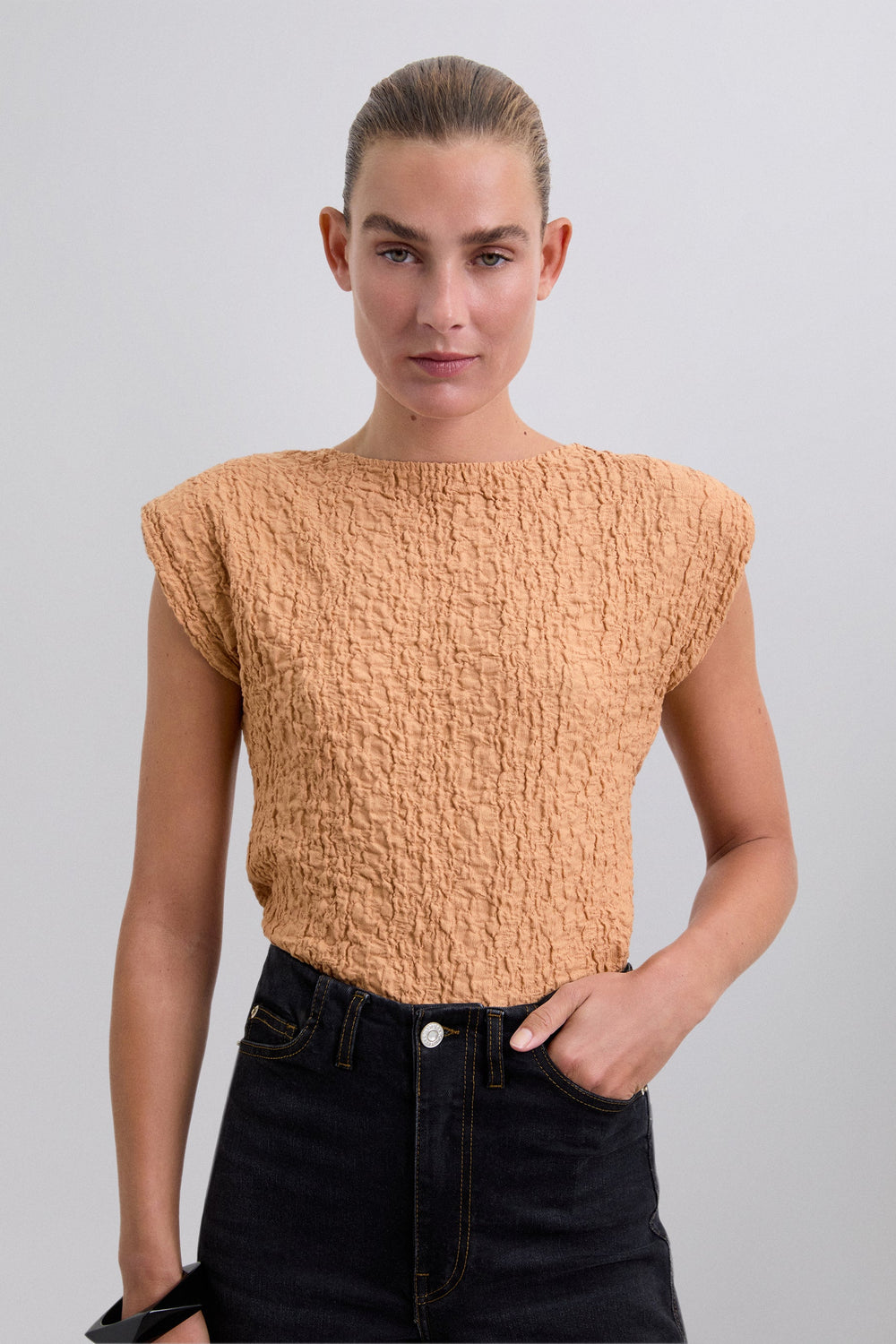 T-shirt confectionné dans un mélange de coton légèrement extensible à texture crinkle. Coupe slim, col rond et manches courtes à petites épaulettes.