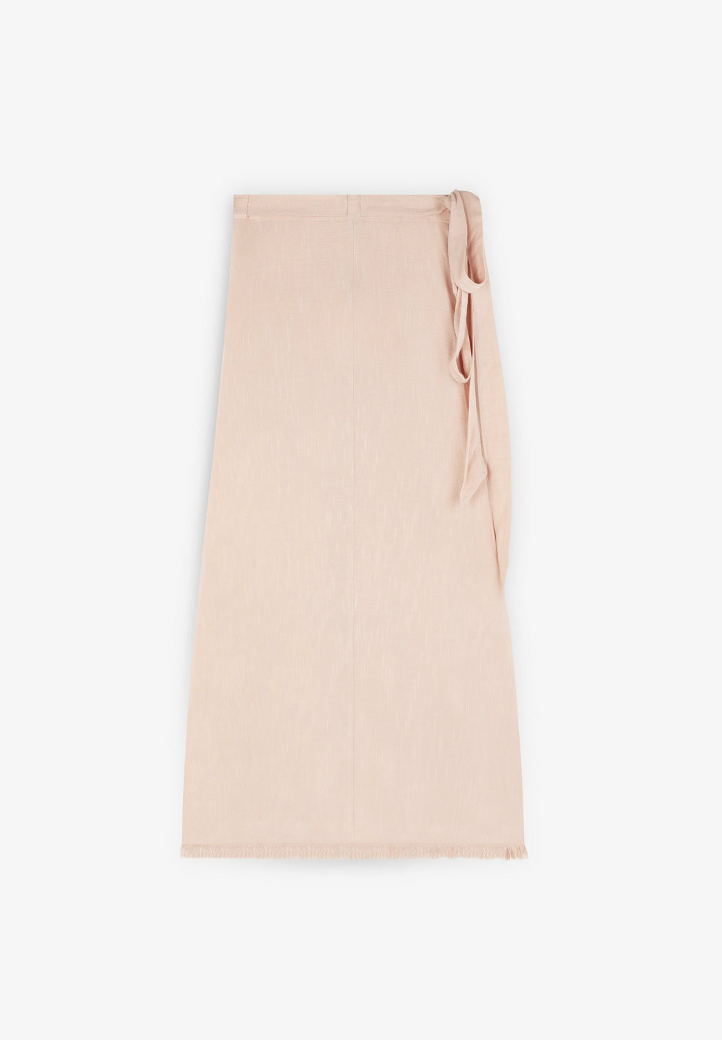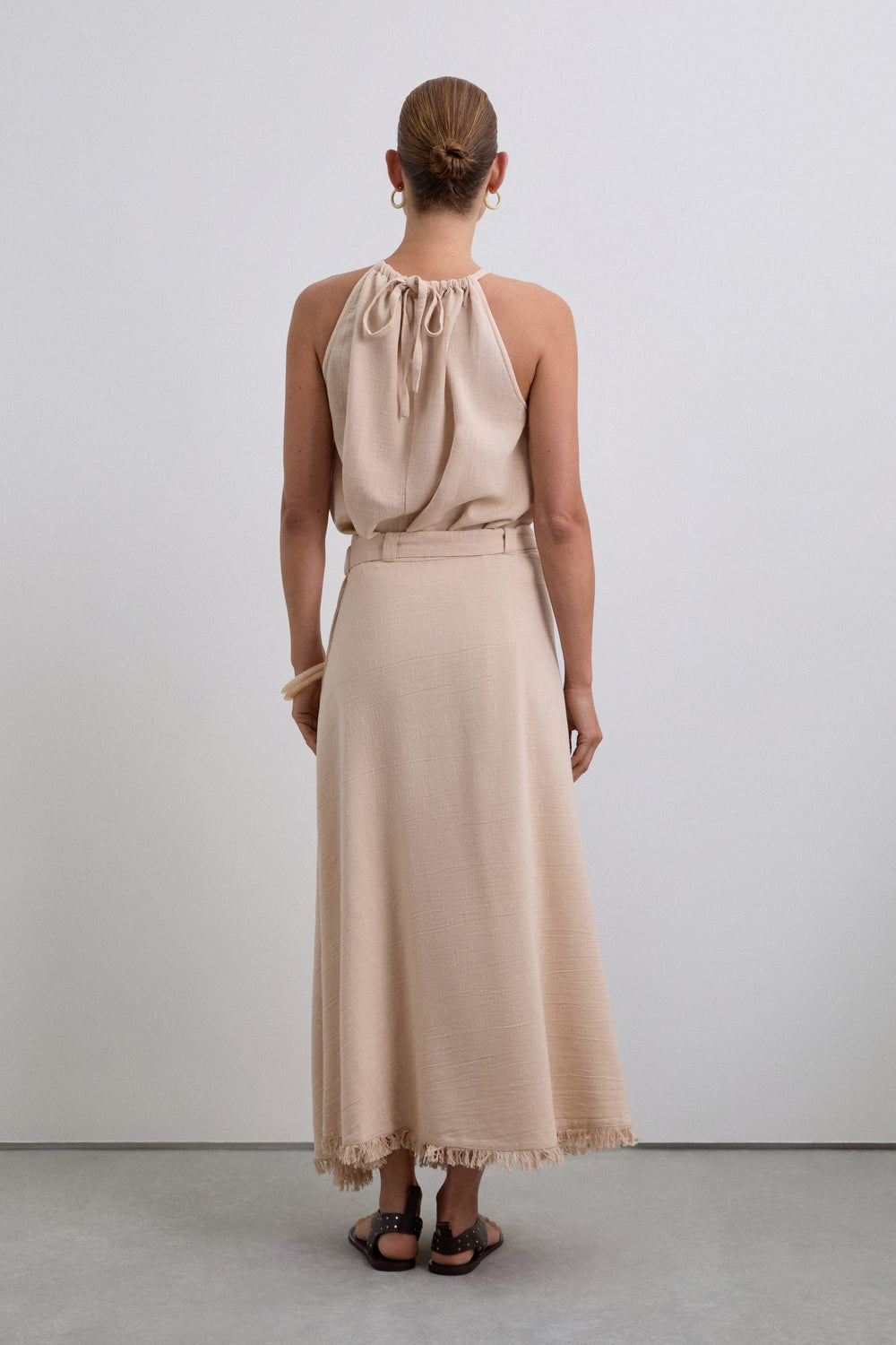 Jupe midi en coton à franges dans le bas. Ceinture nouée sur le côté.