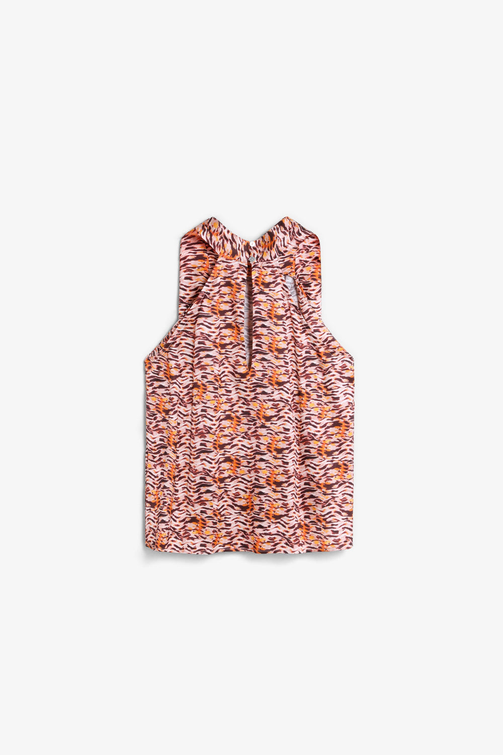 Top à emmanchures américaines. Sans manches. Détail imprimé. Boutonné sur la nuque.