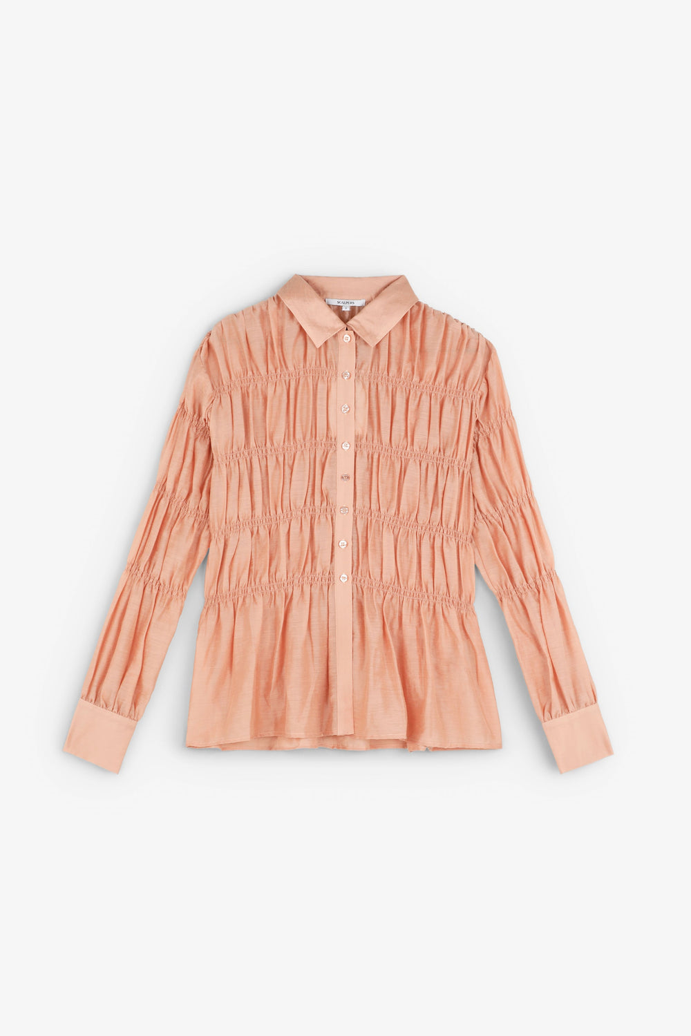 Chemise confectionnée dans un tissu texturé. Manches longues à smock. Fermeture classique de col de chemise sur le devant. Manches longues légèrement bouffantes.