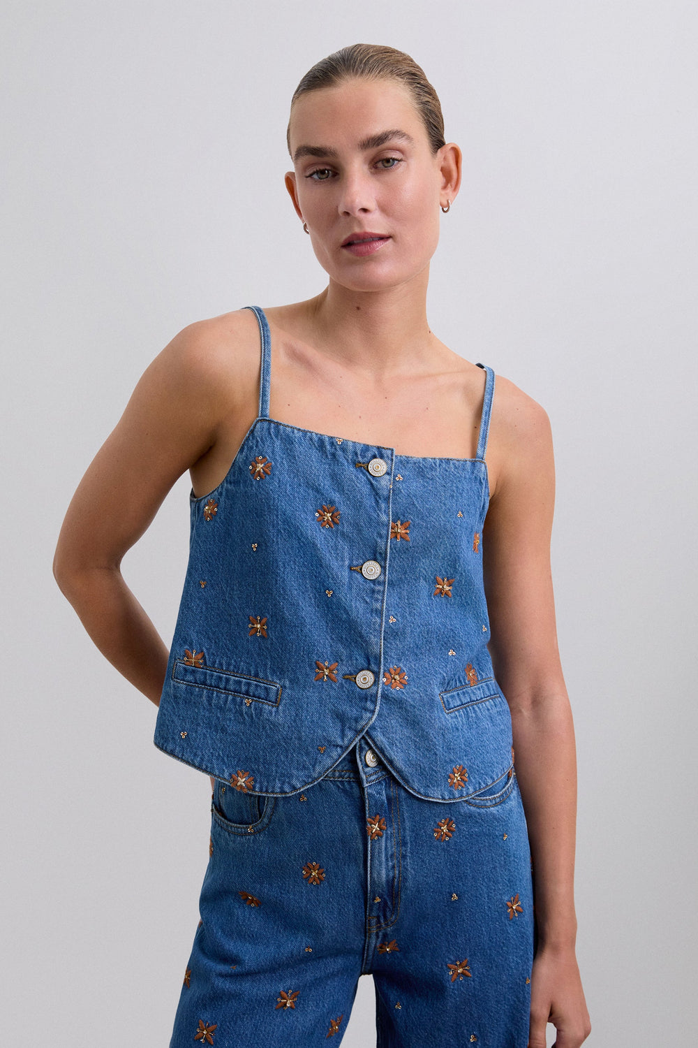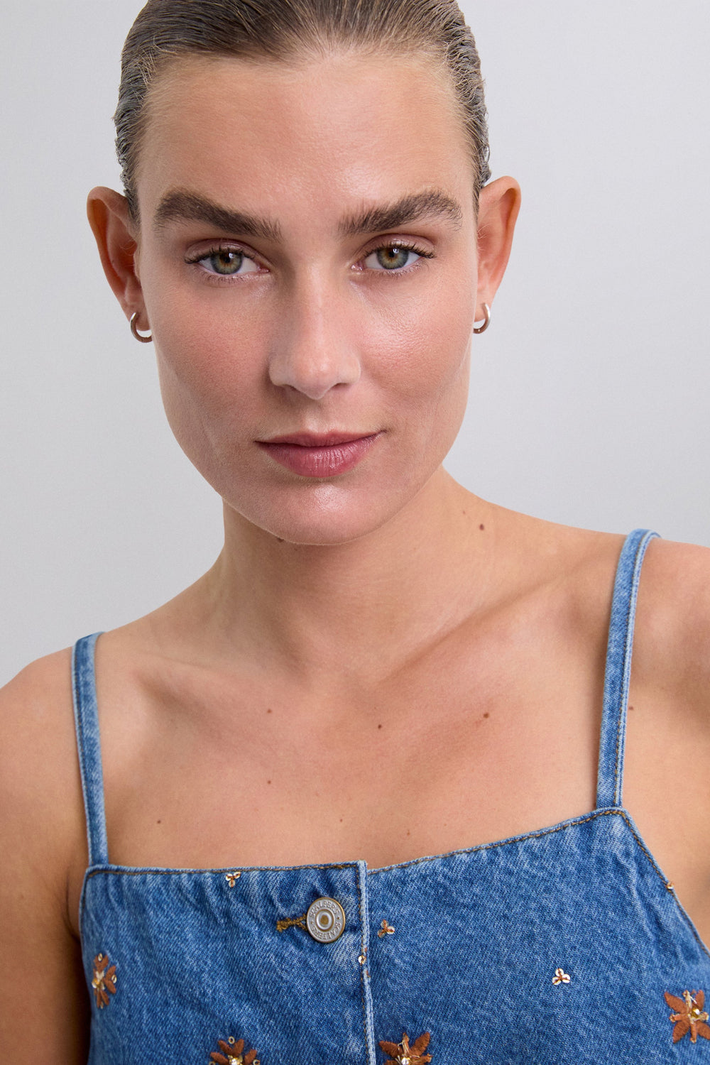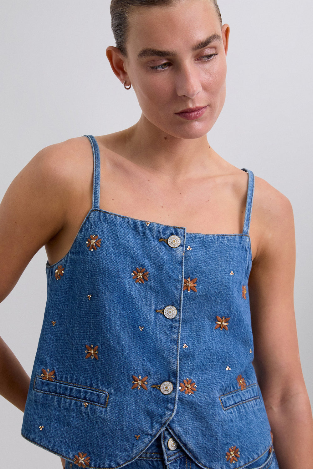 Top à bretelles en coton. Motif floral brodé. Fermeture boutonnée devant. Poches sur le devant.