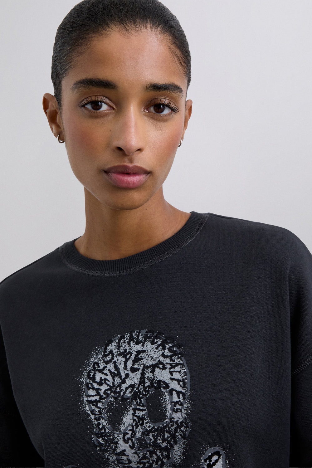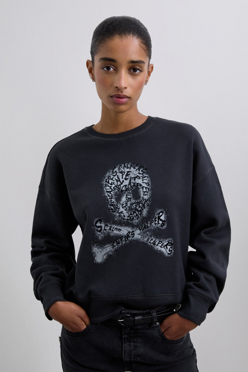 Sweat 100 % coton bio. Coupe droite, col rond et manches longues avec bord de côte aux poignets. Skull à impression floquée sur le devant.