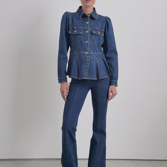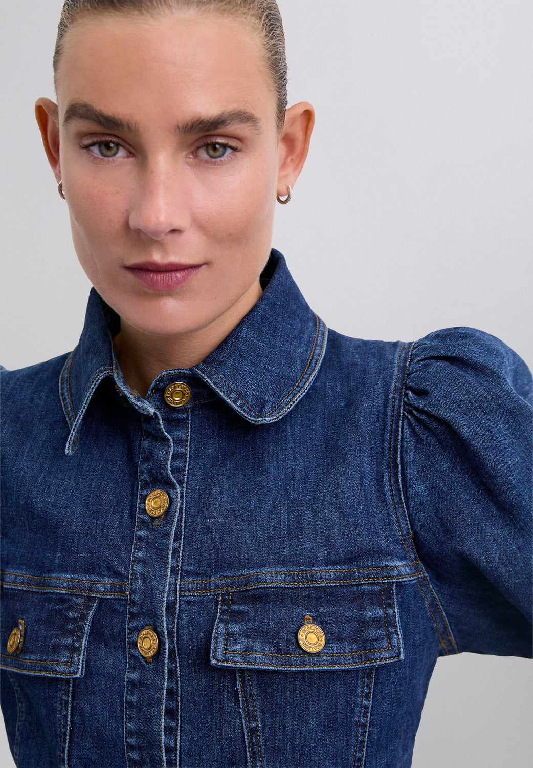 Chemise en jean en coton légèrement extensible. Coupe droite, boutons et manches longues bouffantes à poignets boutonnés. Plis dans le bas et fronces sur les épaules.