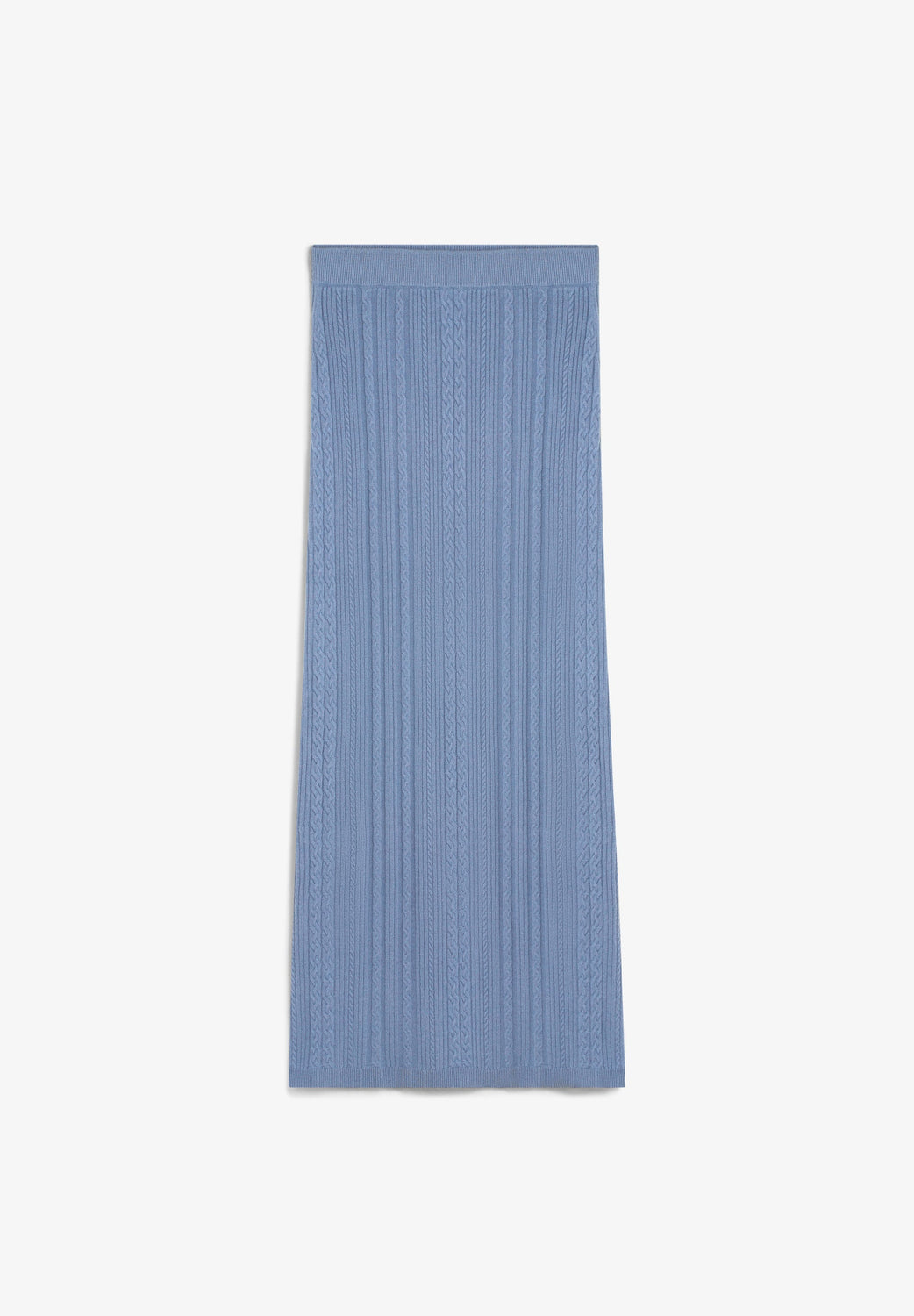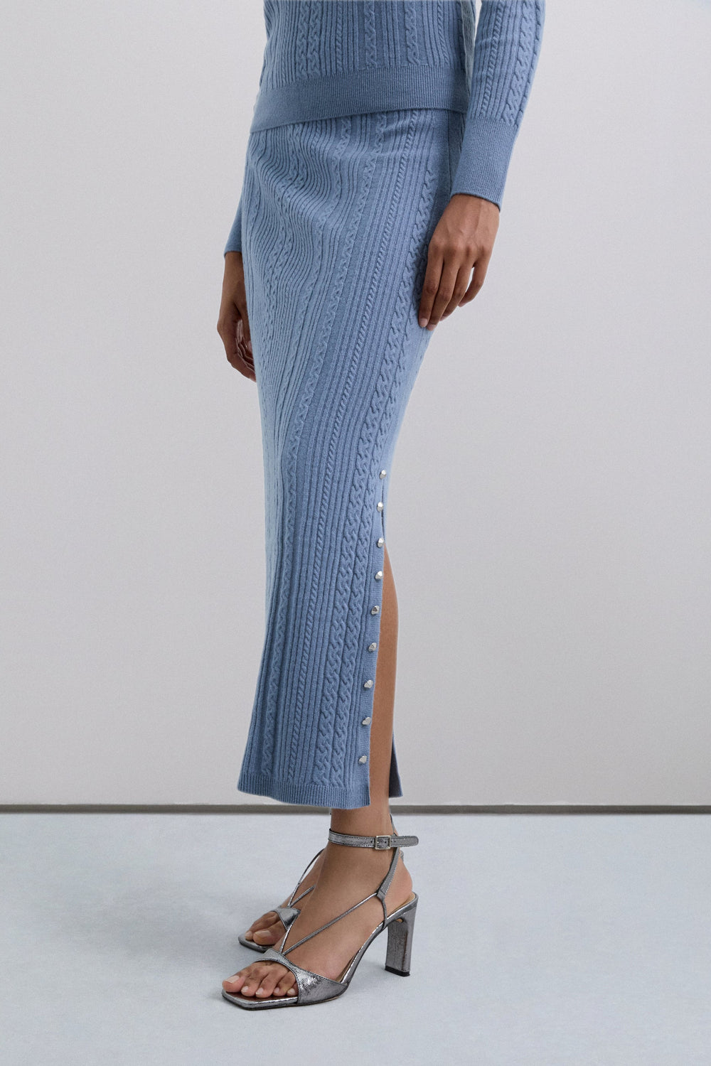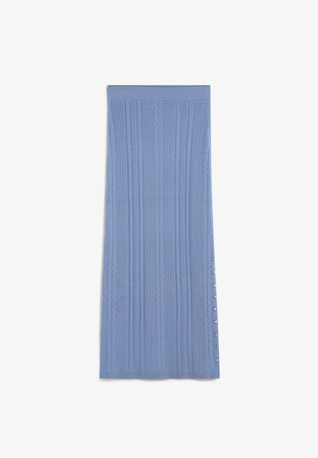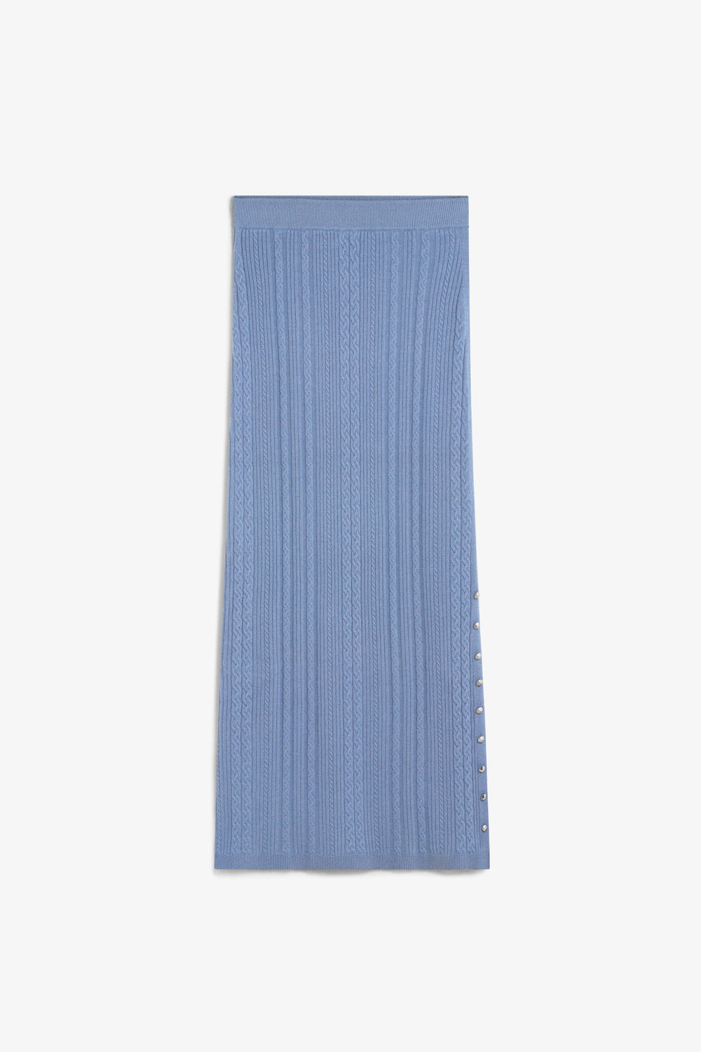 Jupe midi confectionnée dans un mélange de laine. Taille élastique. Fendue sur le côté. Boutons.