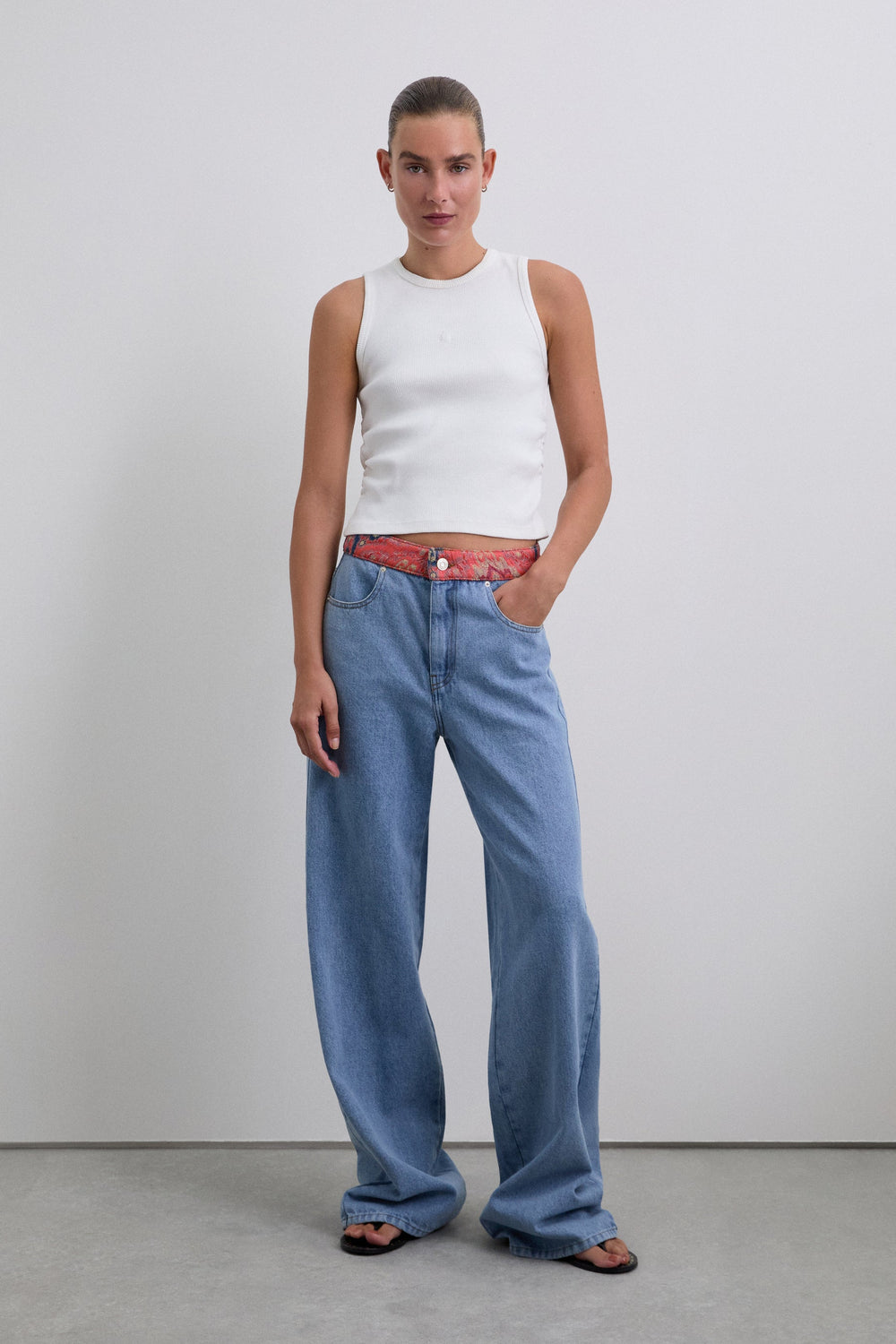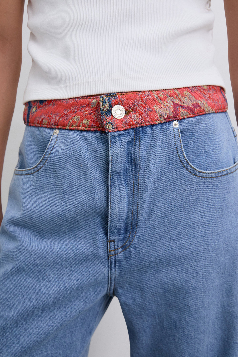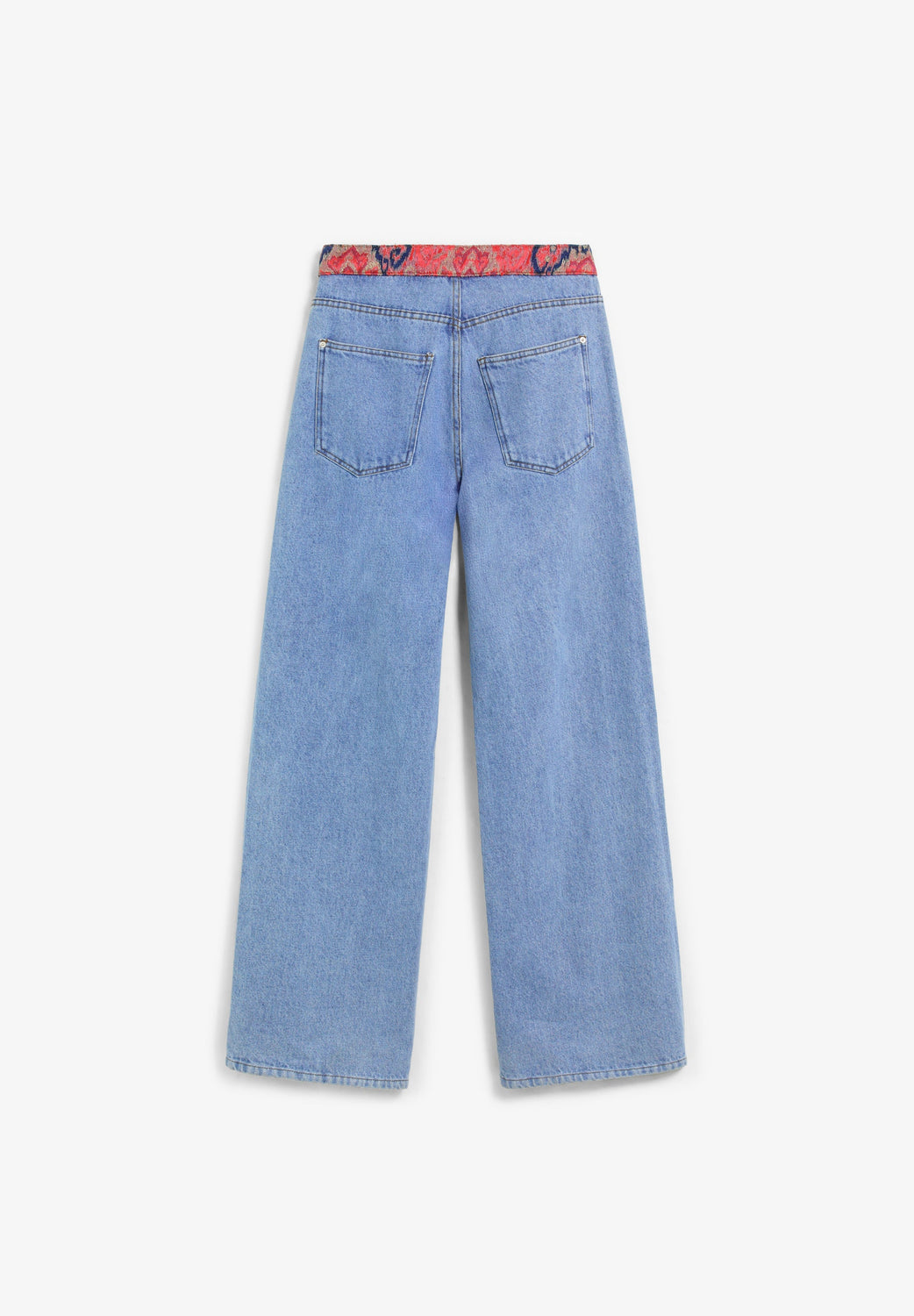 Pantalon en denim, taille moyenne. Tissu contrastant à la taille. Bouton de fermeture. Poches à l’avant et à l’arrière.