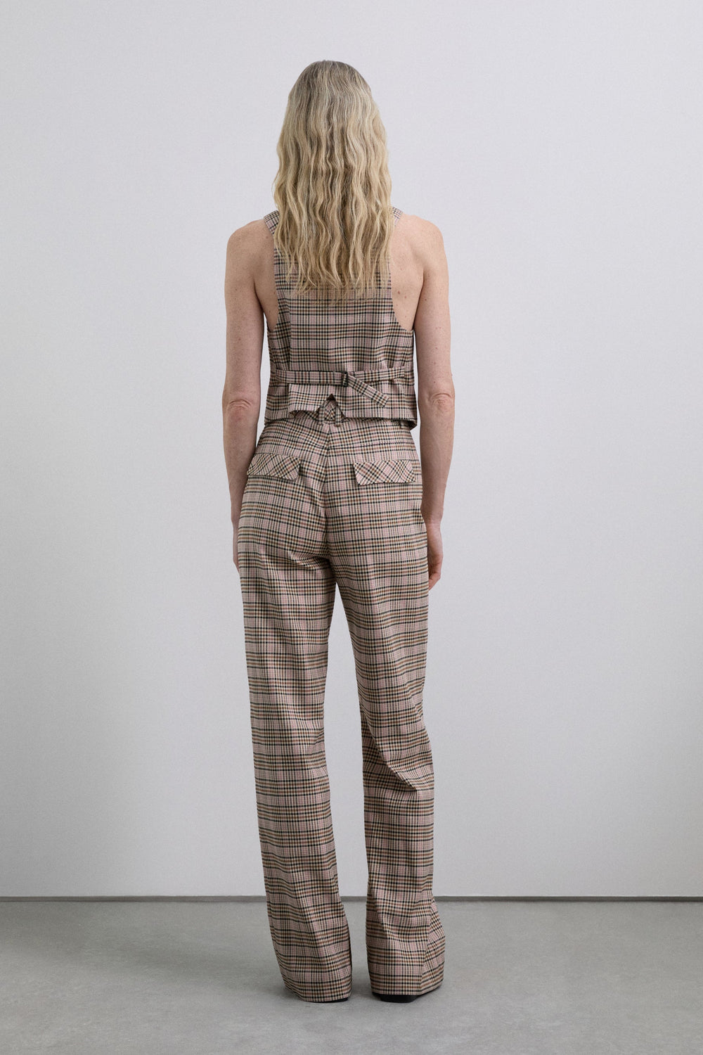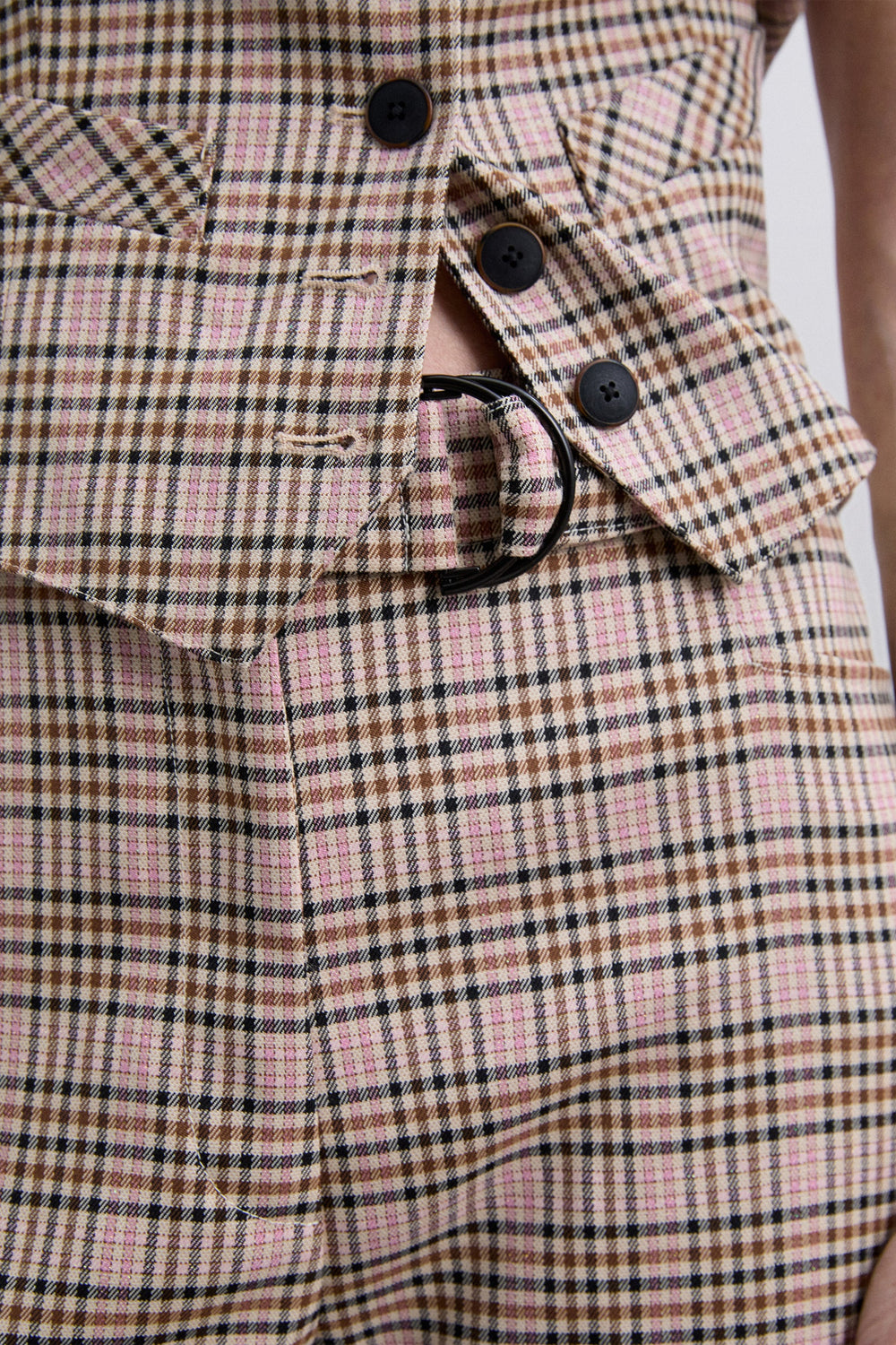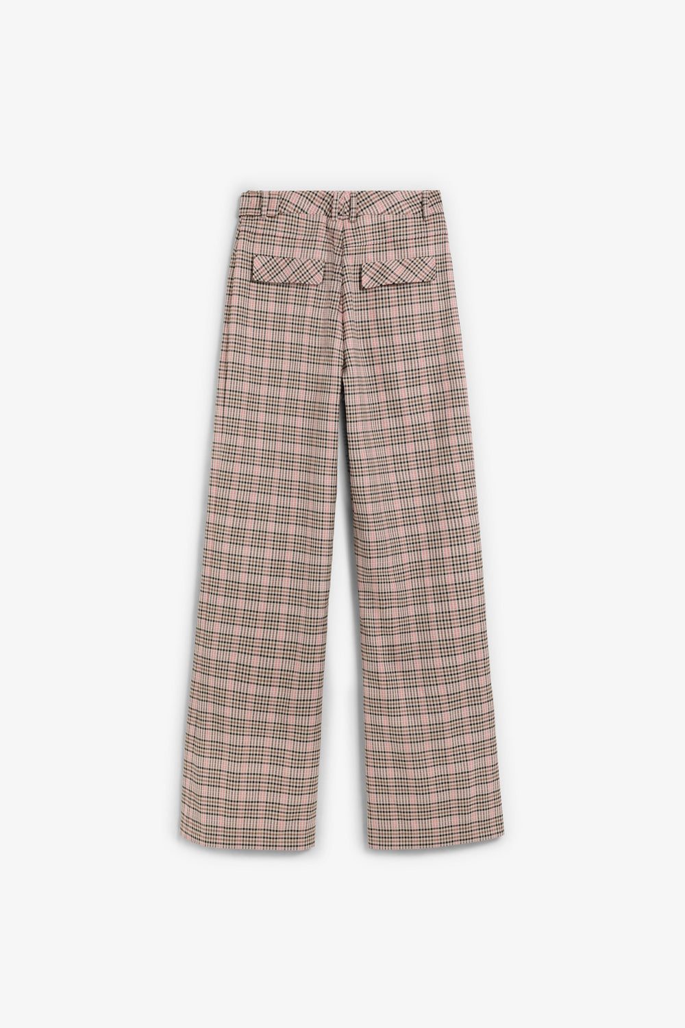 Pantalon large. Poches sur le devant. Poche à rabat derrière. Passants de ceinture. À carreaux.