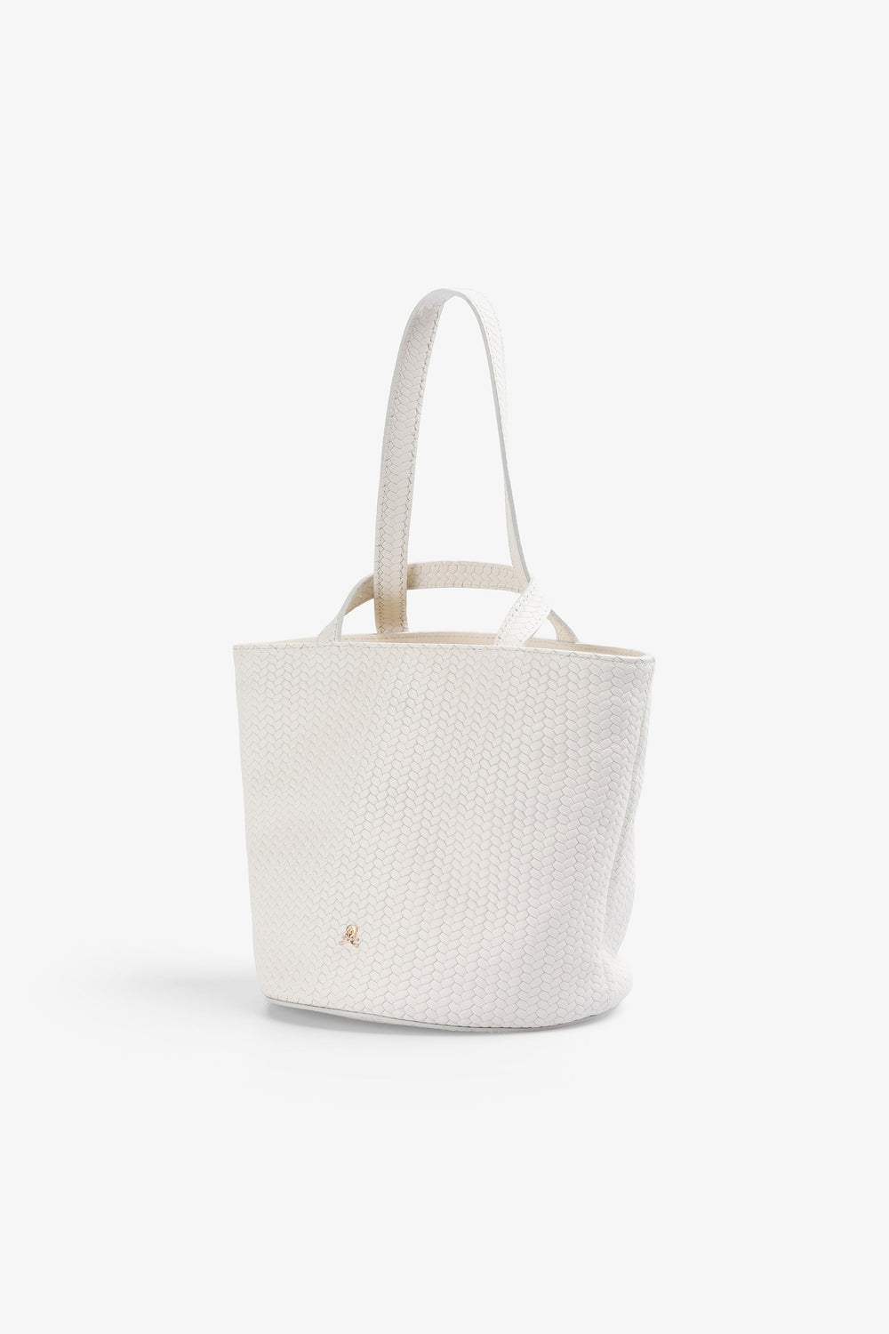 Sac seau 100 % cuir tressé. Doublure avec poche à fermeture éclair. Logo en métal devant. Anse courte.
