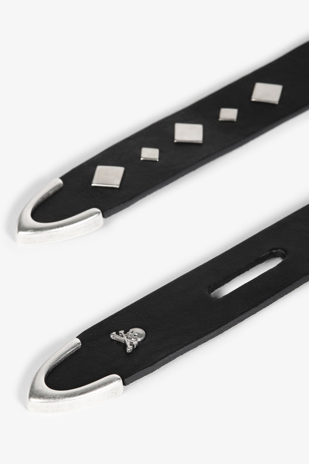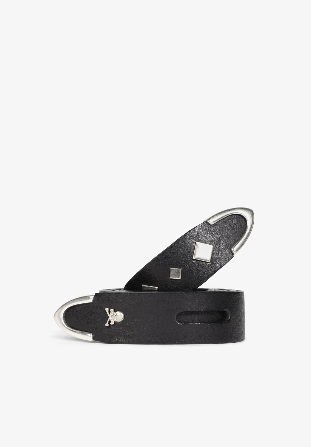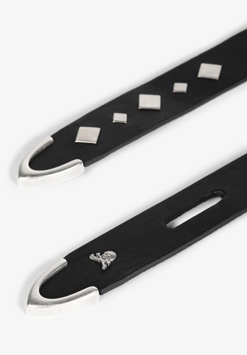 Belt with skull detail and studs in 100% leather. Knot fastening. Length: 123 cm / Width: 3 cm.