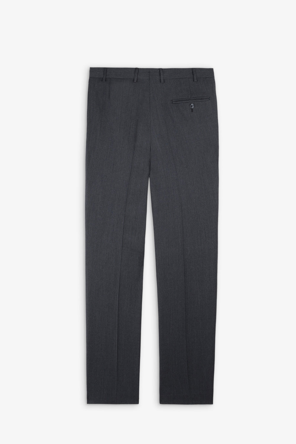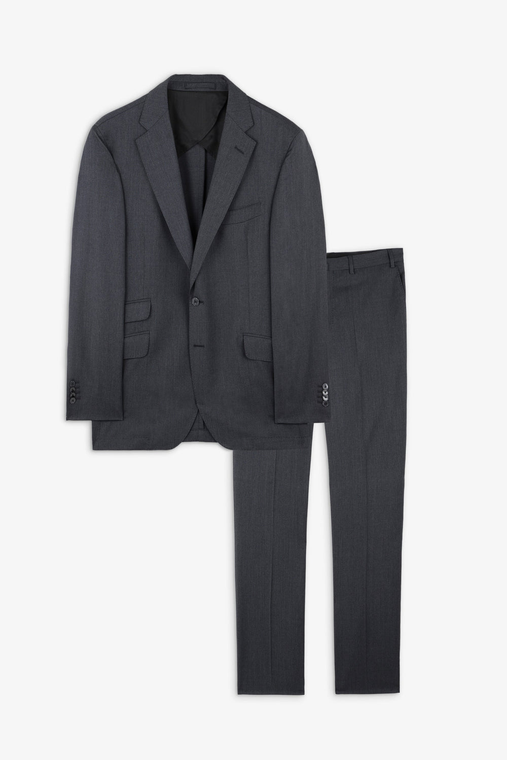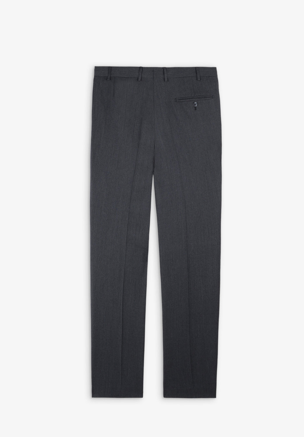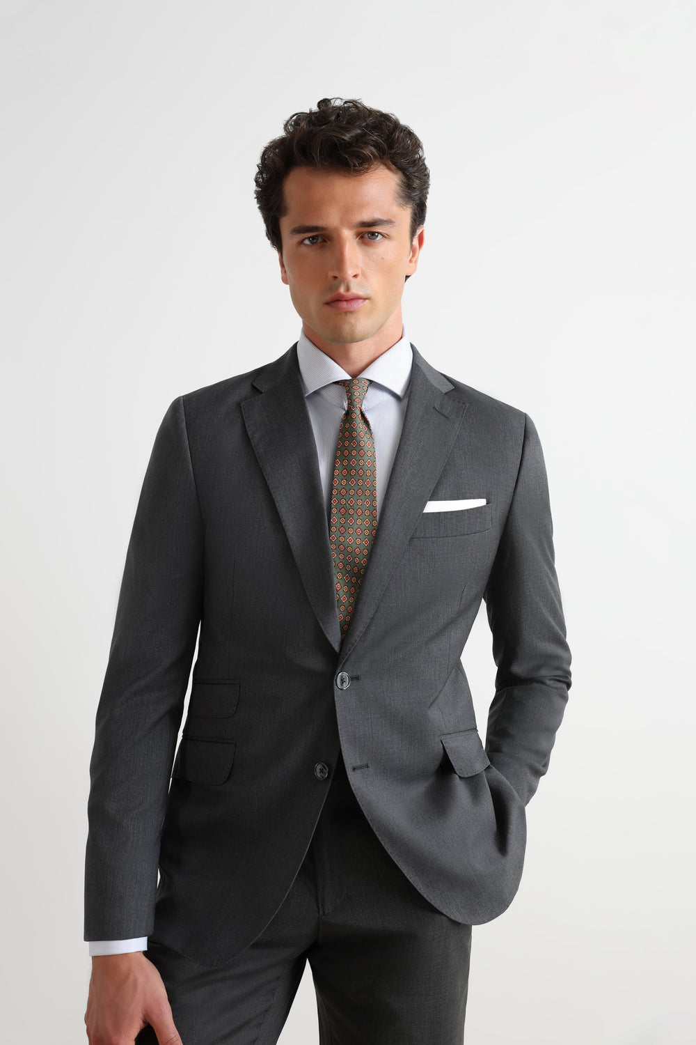 Grey textured suit. Crafted from 100% Marlane wool fabric. Regular Fit. Half lining. Blazer with notch lapels, button fastening, and flap pockets. Long sleeves with structured shoulder pads and functional buttonholes. Straight-leg trousers with extended buttoned waistband and zip fastening, finished with a plain hem.
