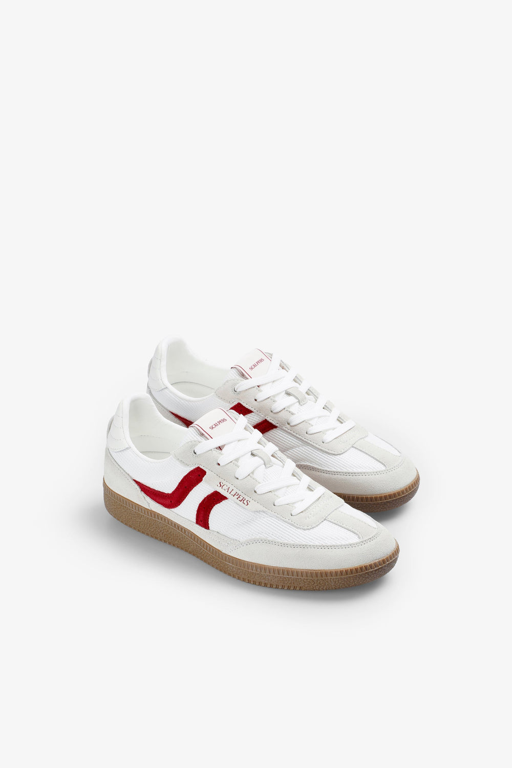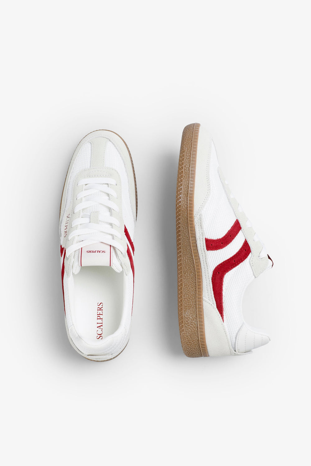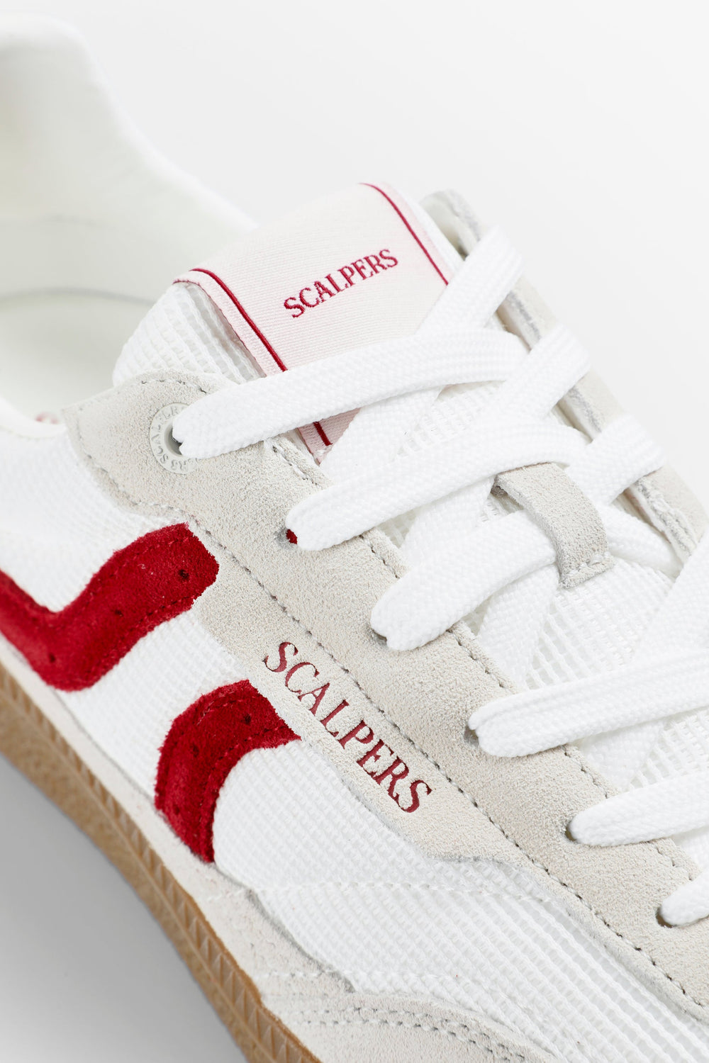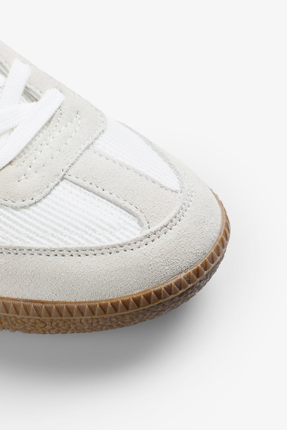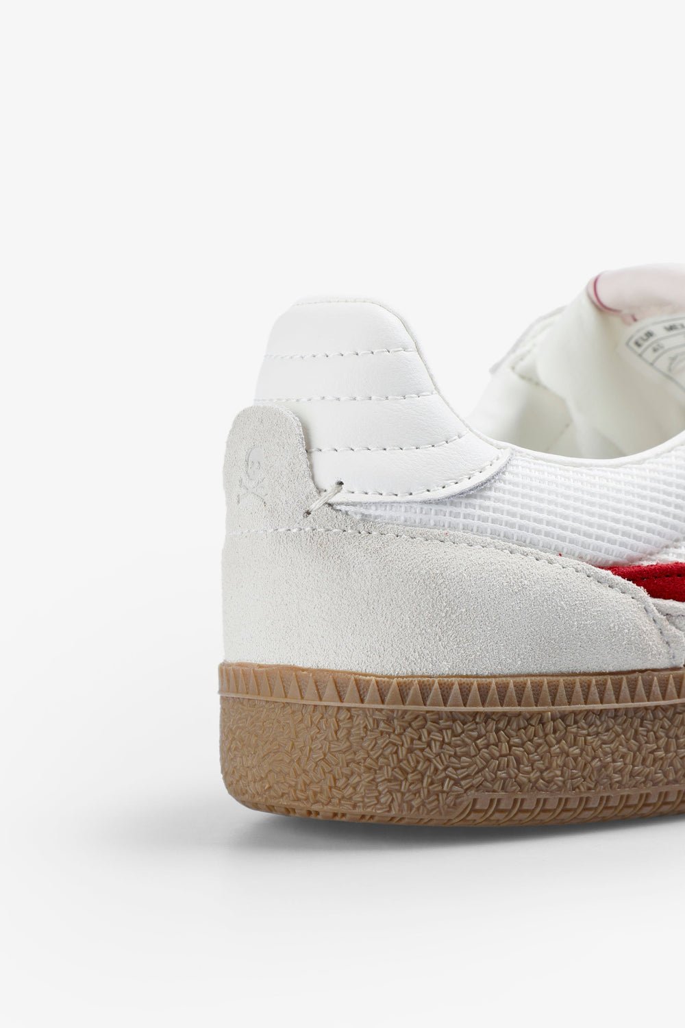 Tennis en daim. Logo contrastant sur le côté et la languette. Coutures à l’arrière.