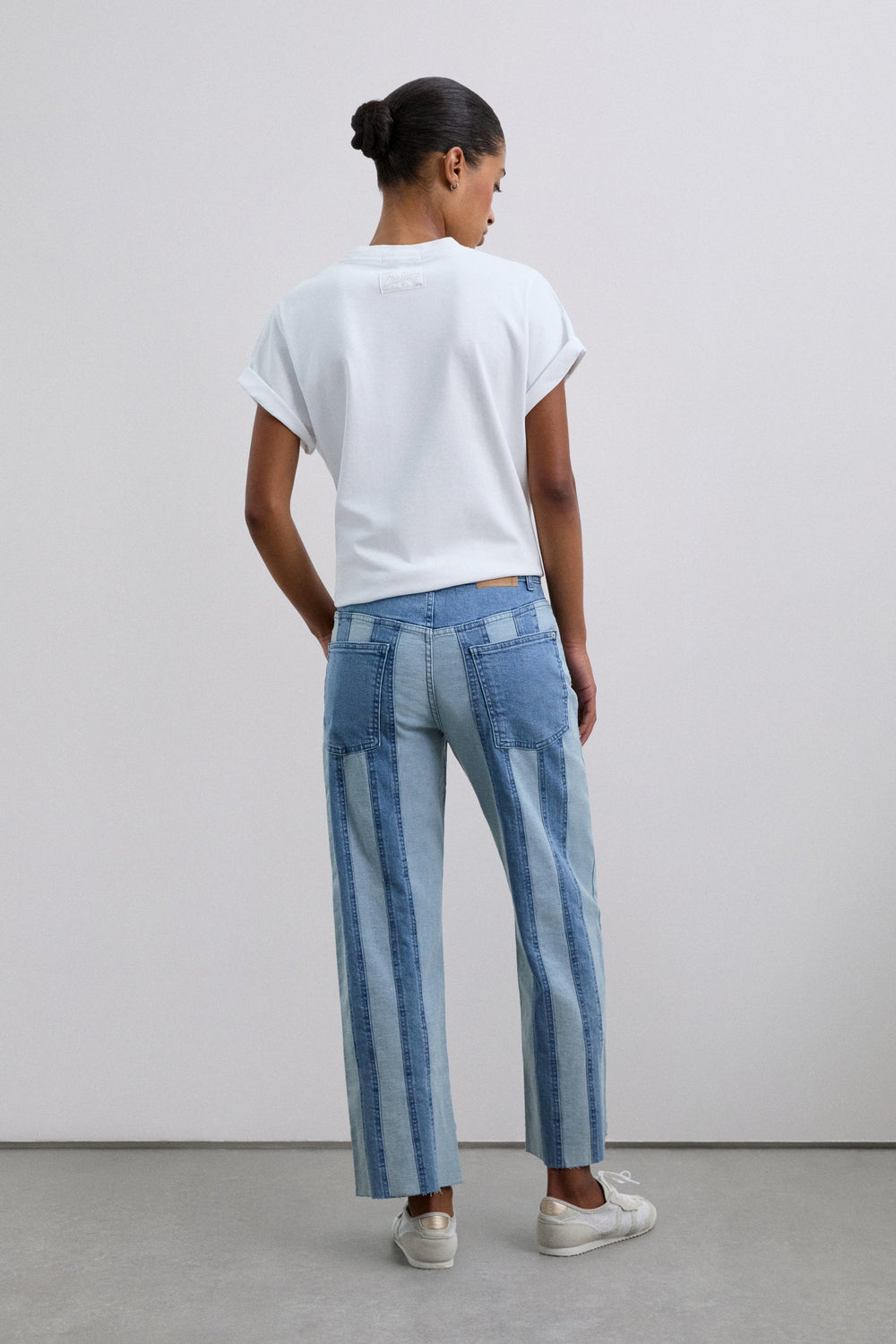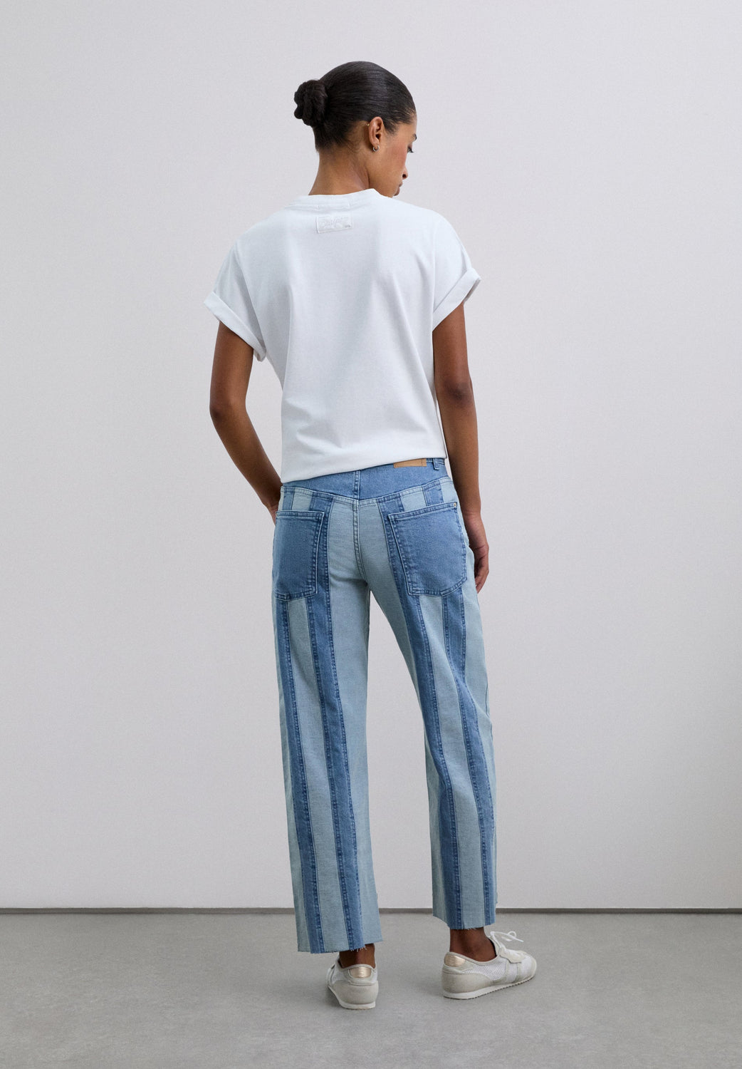 Jean composé à 98 % de coton biologique BCI. Coupe droite. Deux poches sur le devant. Deux poches à l’arrière. Détail en denim contrastant à motif rayé. Bouton et fermeture Éclair sur le devant.