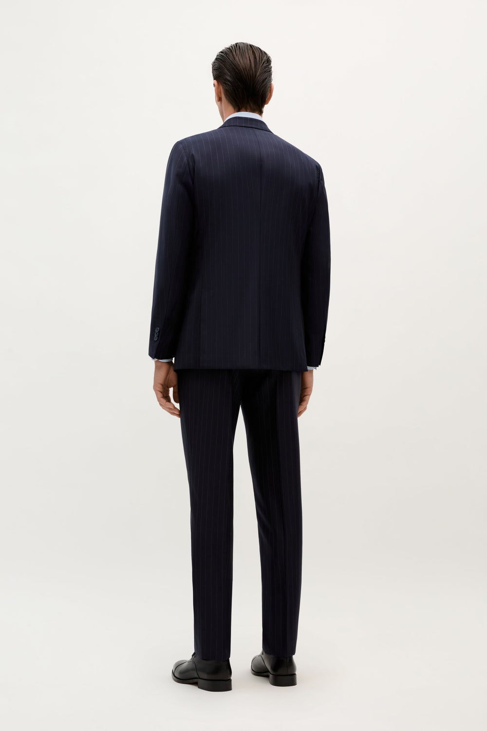 Pantalon 100 % laine italienne. Fermeture éclair dissimulée sous patte, agrafe et patte de boutonnage. Deux poches sur les côtés. Poches boutonnées derrière. Fabriqué au Portugal.