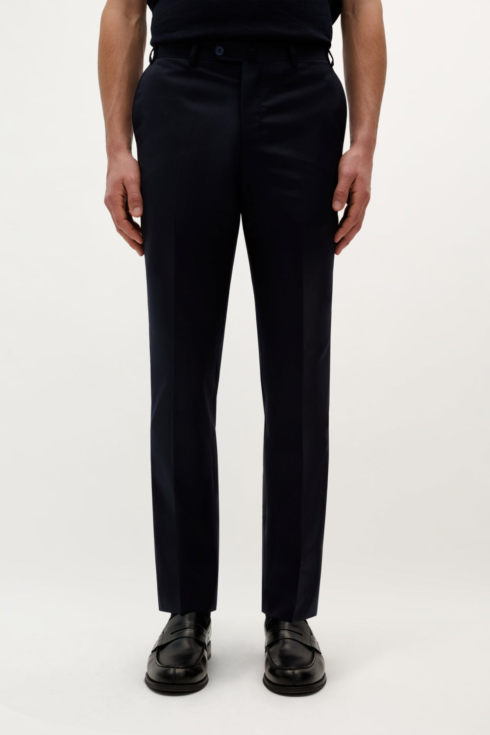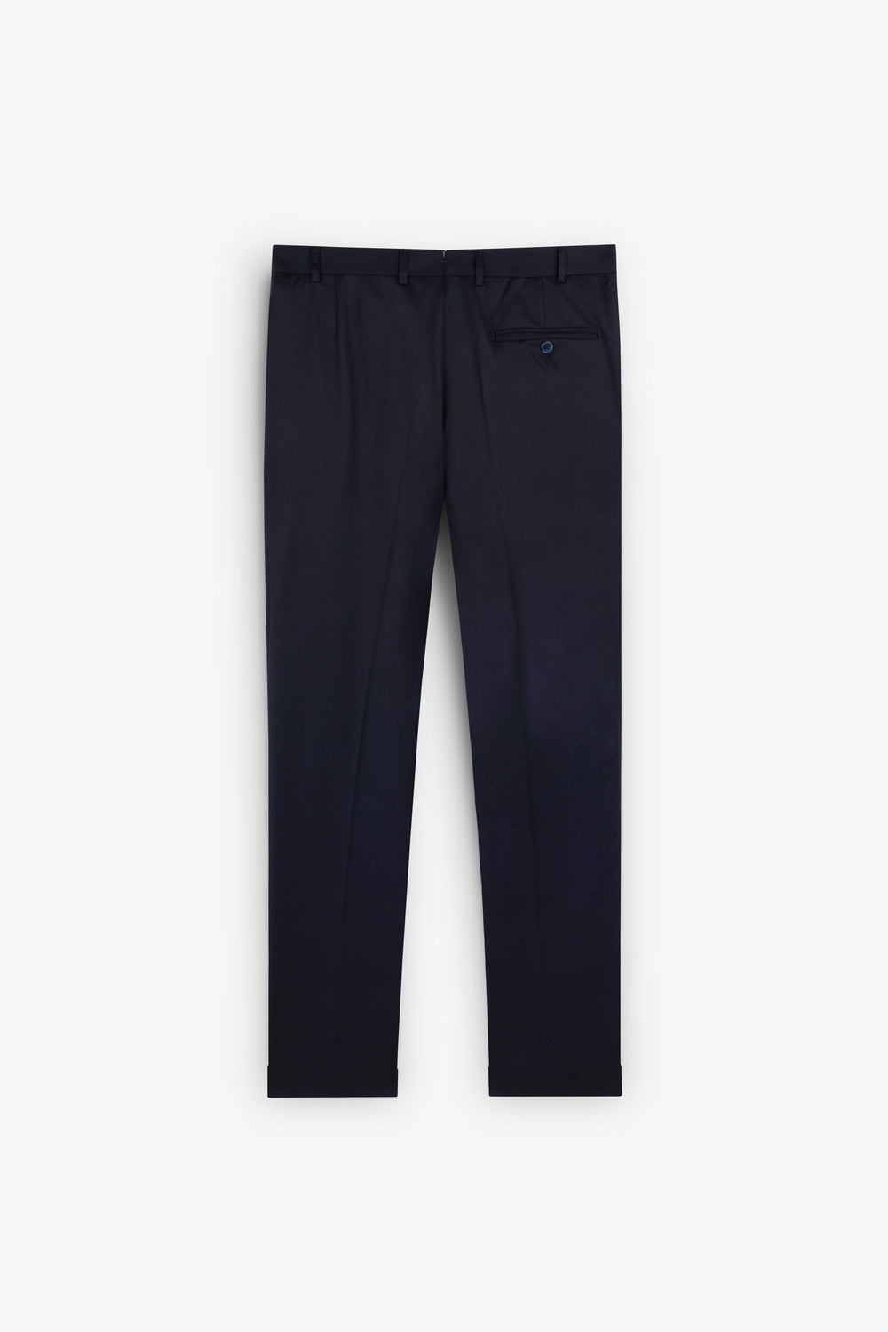 Pantalon 100 % laine italienne. Fermeture éclair dissimulée sous patte, agrafe et patte de boutonnage. Deux poches sur les côtés. Poches boutonnées derrière. Fabriqué au Portugal.