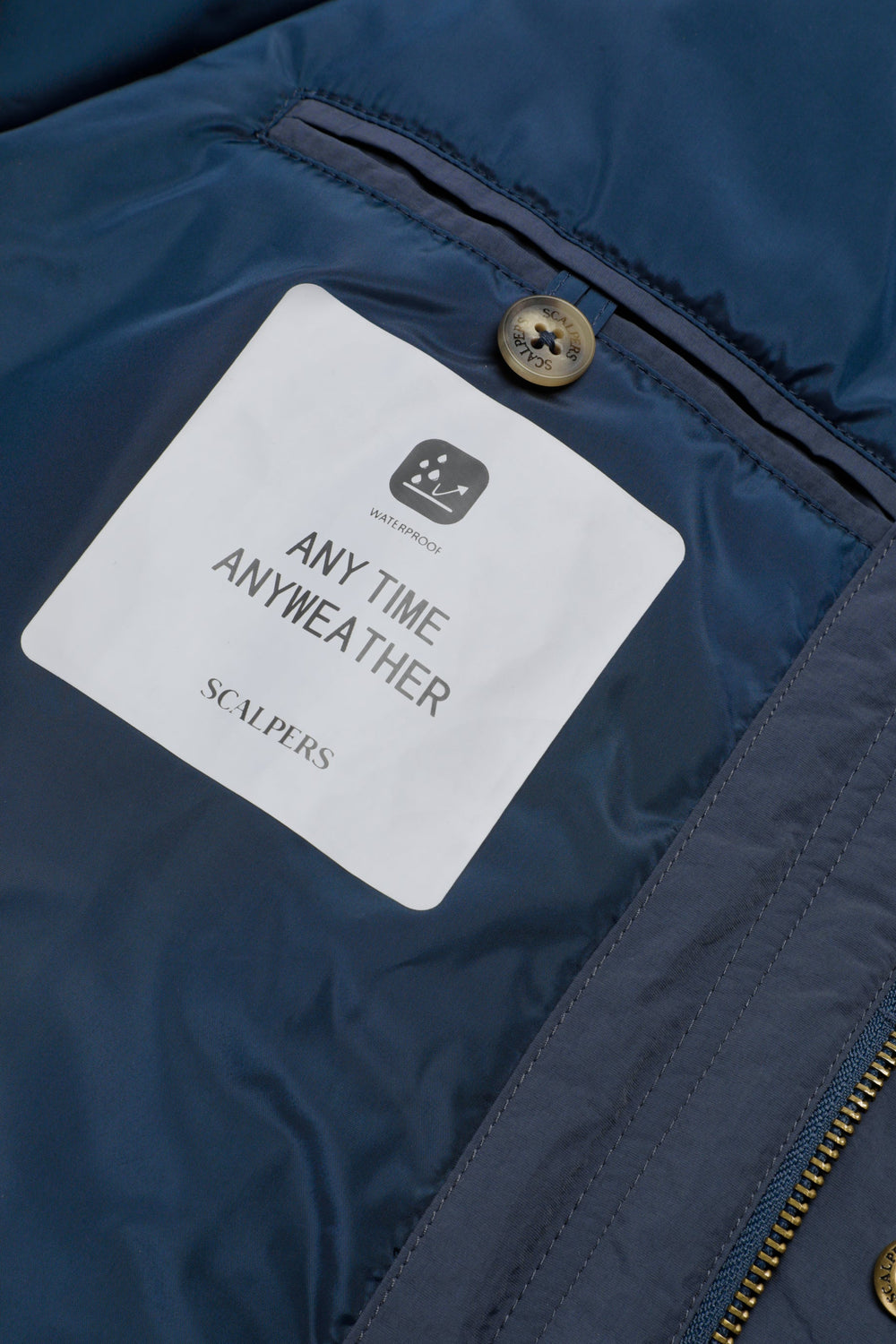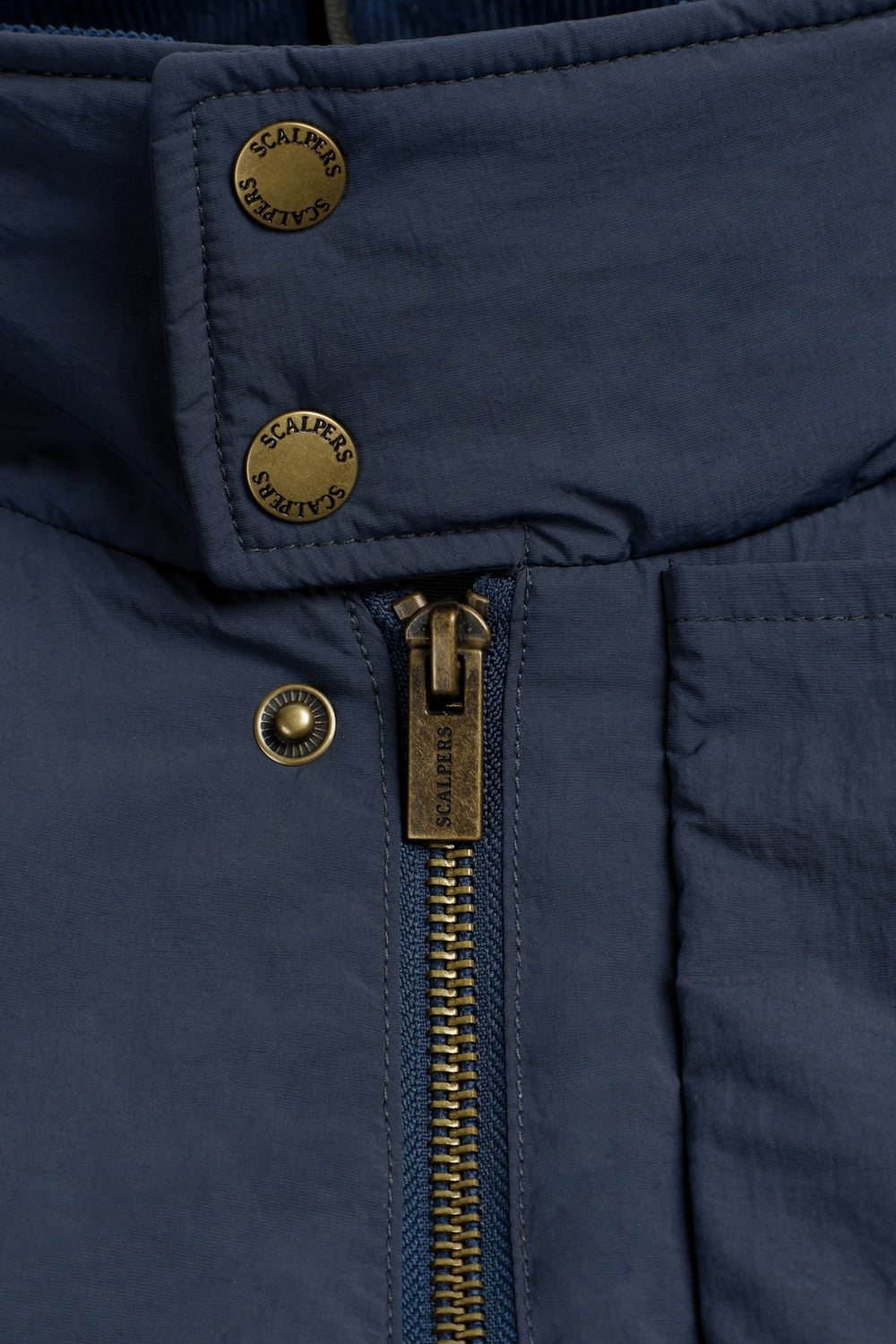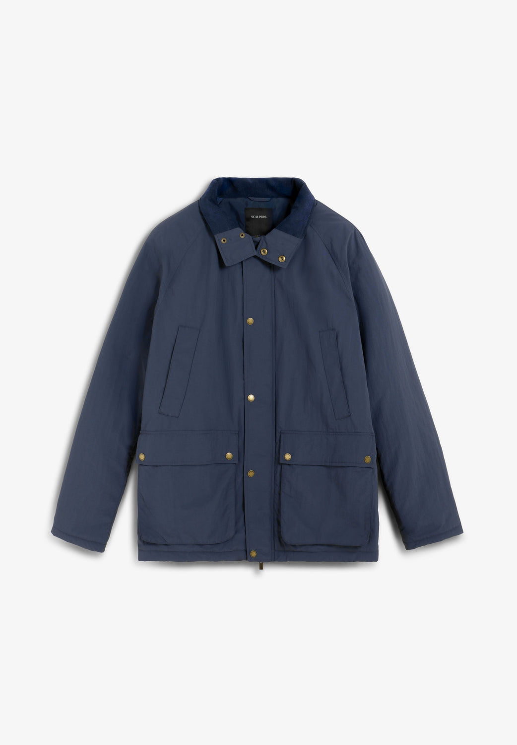 Veste technique imperméable à manches raglan. Quatre poches sur le devant. Fermeture Éclair cachée et boutons-pression. Étiquette Scalpers sur le côté et tirette Scalpers personnalisée. Détail en velours côtelé ton sur ton à l’intérieur du col.