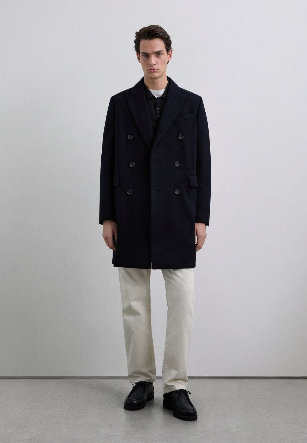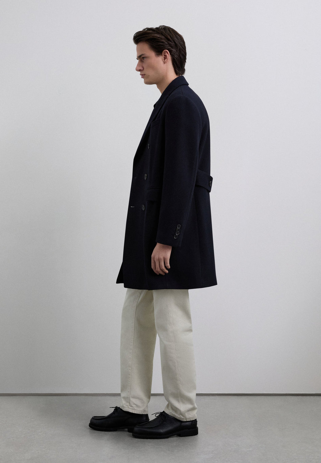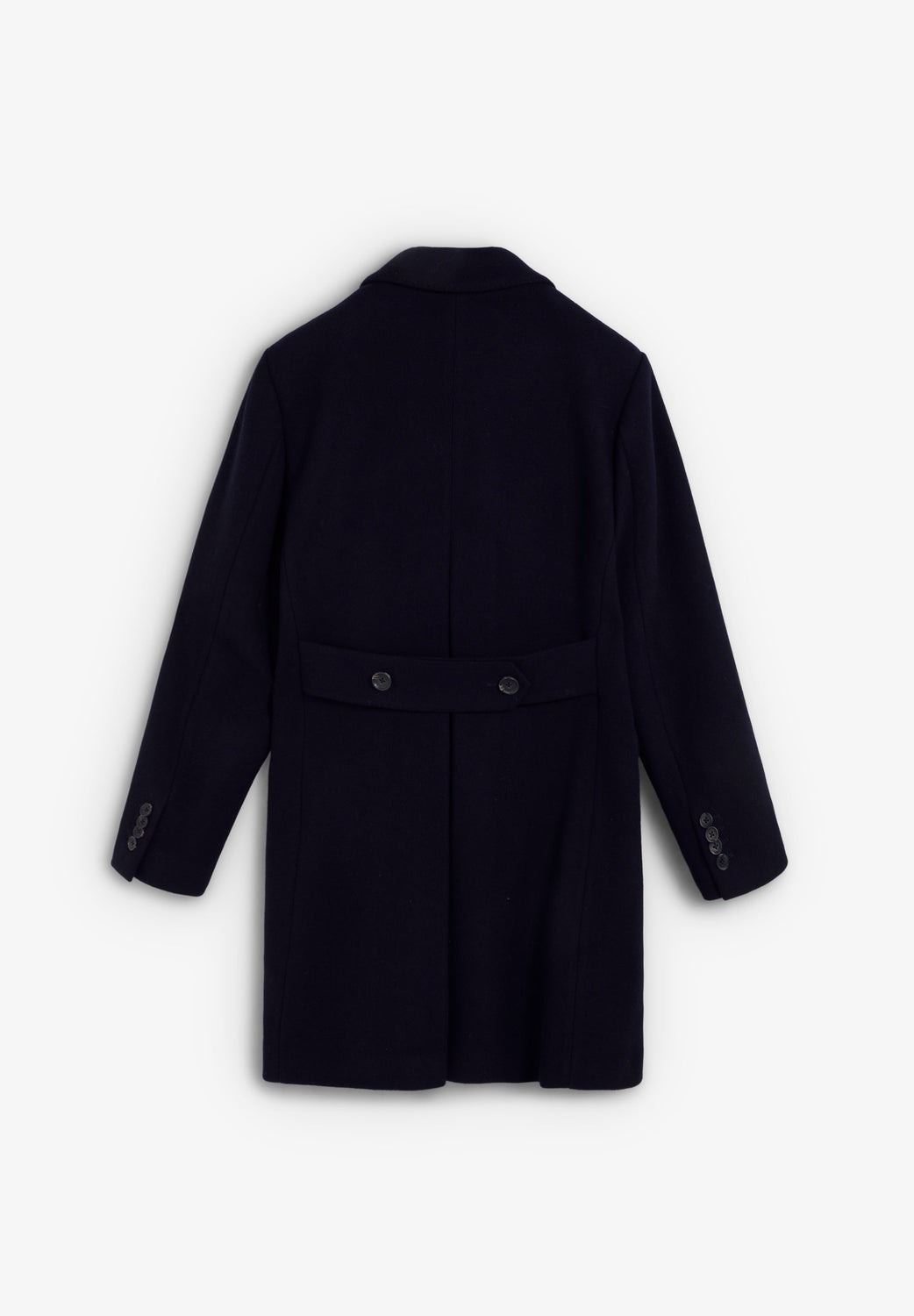 Manteau en laine. Col à revers en pointe et manches longues. Boutons de manchette personnalisés. Poches à rabats sur le devant. Bas plissé au centre du dos. Fermeture croisée boutonnée sur le devant.